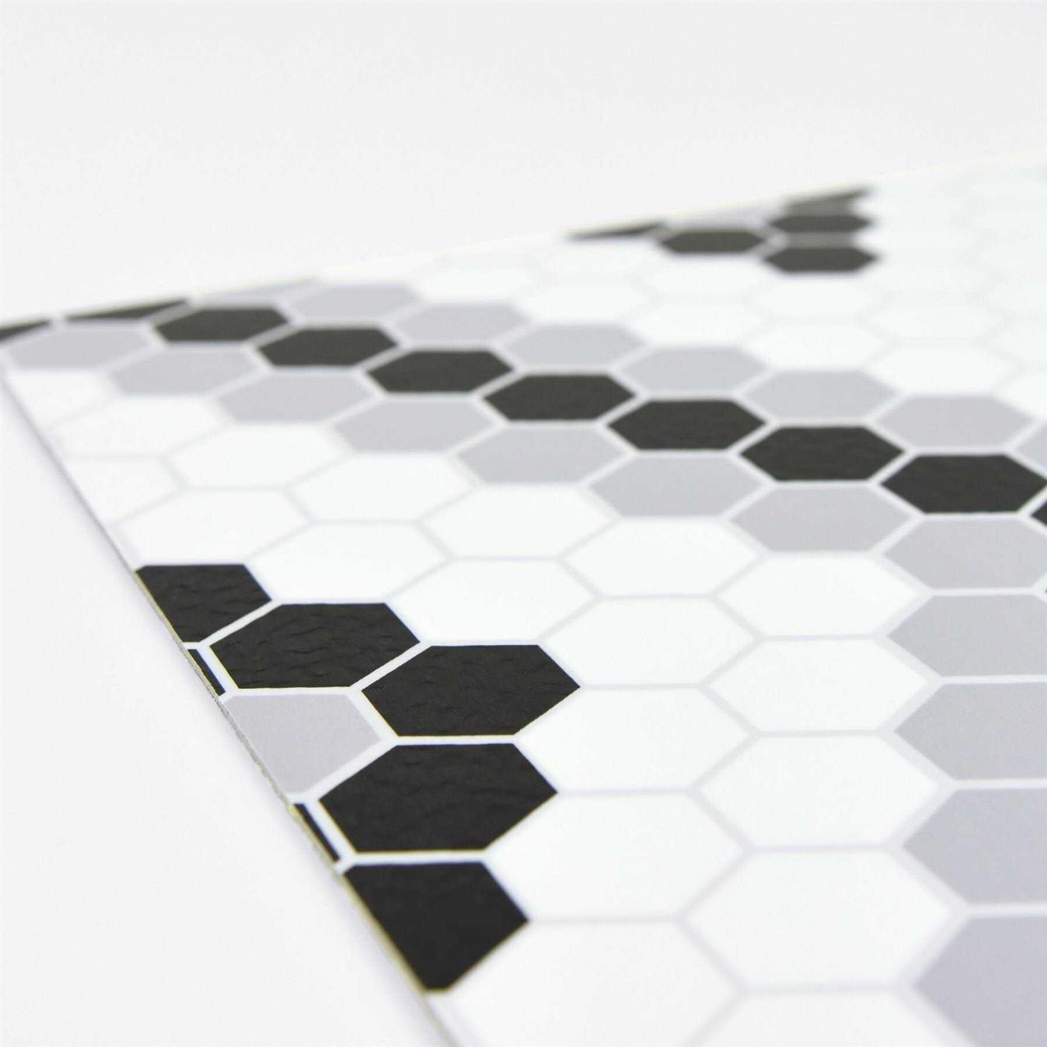 A classic black and white hexagon print with a contemporary flair. These peel and stick tiles are the perfect DIY solution to remodeling floors. Leyton Peel & Stick Floor Tiles Set contains 20 pieces on 20 sheets that each measure 12 x 12 inches.