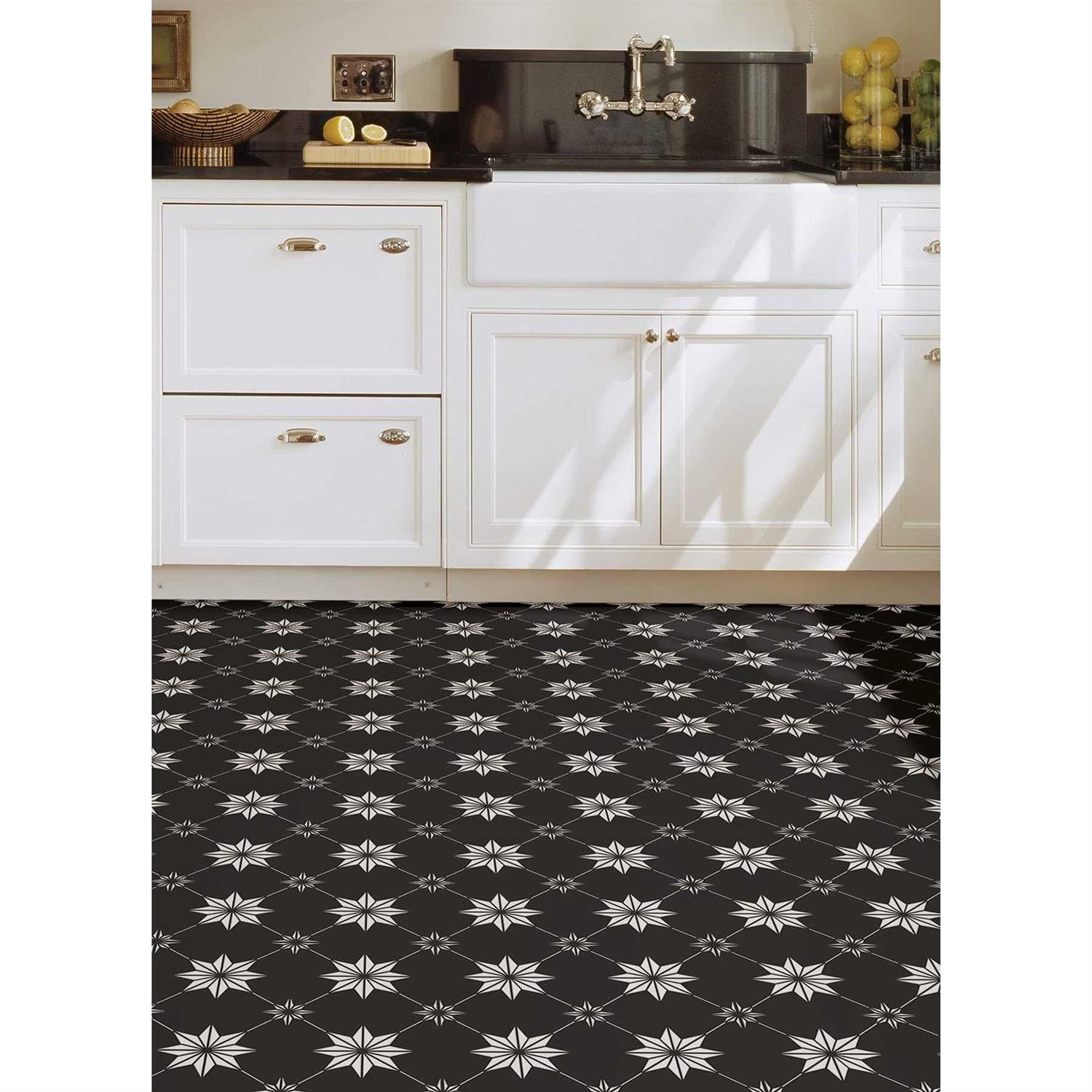 Achieve a bold yet polished look in any room with these black and white peel and stick floor tiles. Star motifs shine brightly in a crisp white hue against a black backdrop. Rigel Peel and Stick Floor Tiles contains 10 pieces on 10 sheets that measure 12 x 12 inches. This product measures 60in x 24in x 0.06in when assembled.