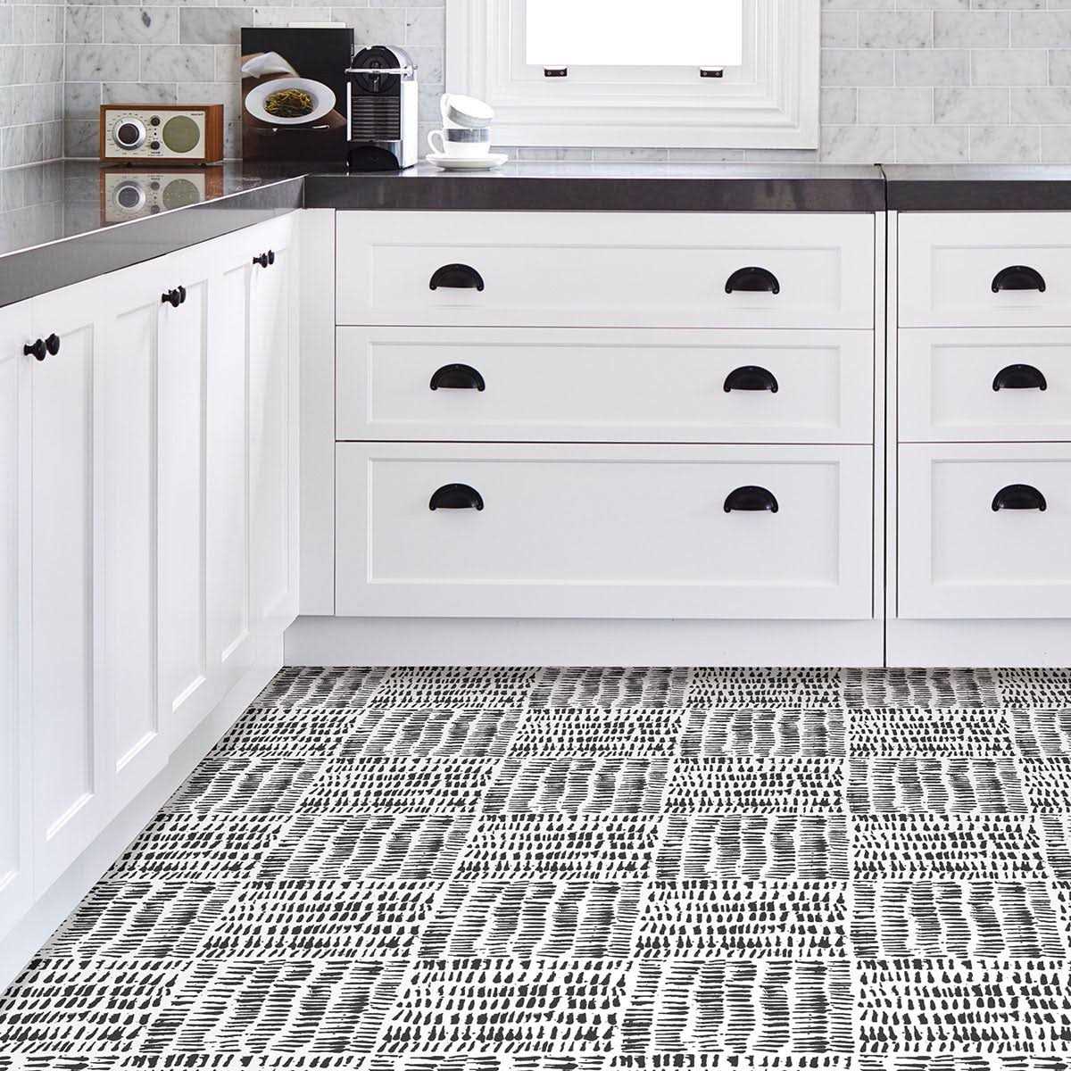- Black and white peel and stick vinyl floor tile with a bold and modern style