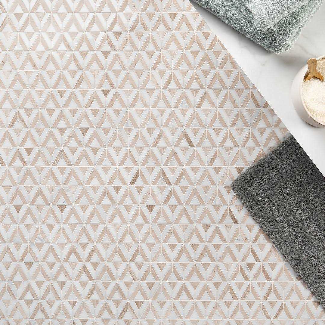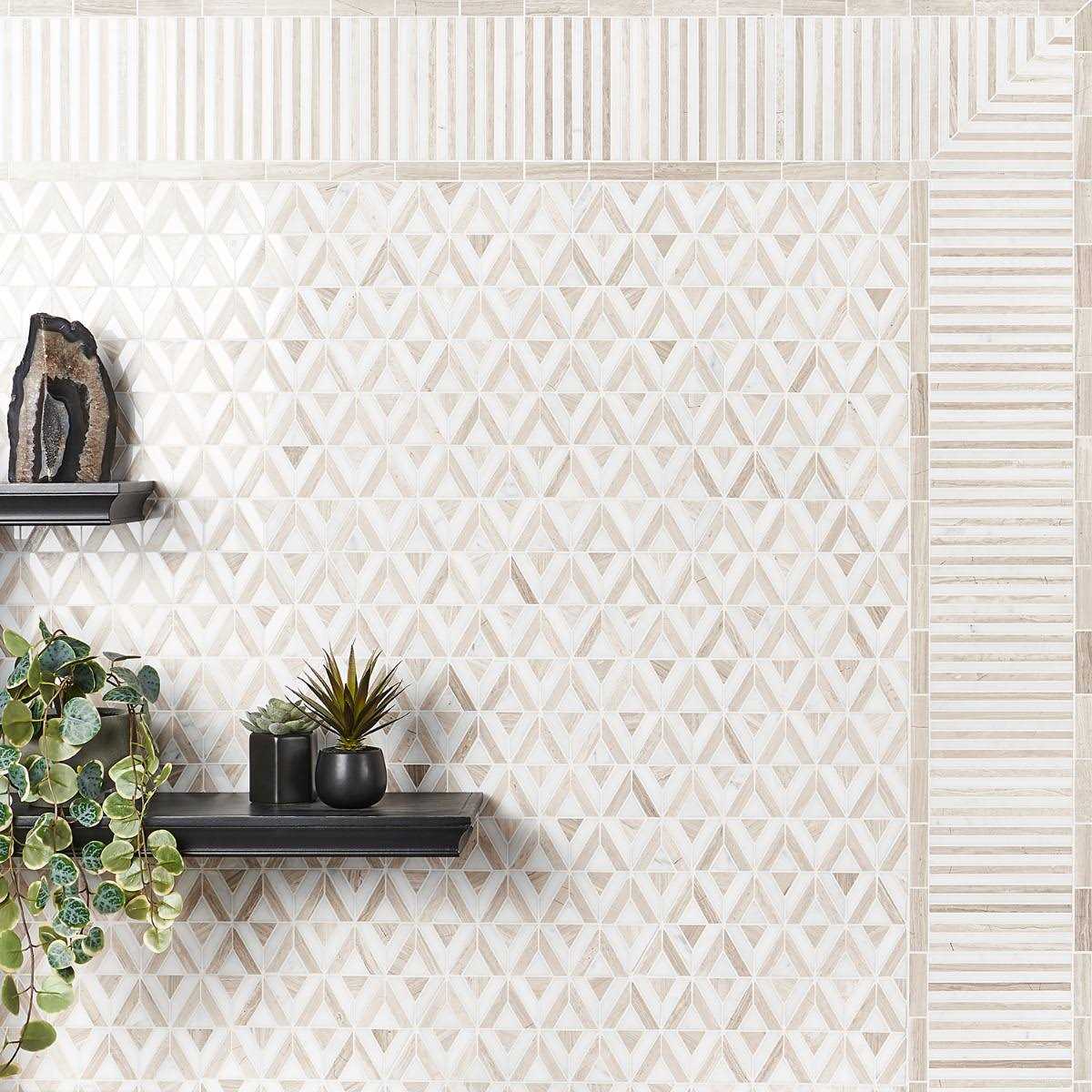 This is an immaculate, marble mosaic collection made from mixed materials and geometric patterns. The mosaics create an element of decadent living with their noticeably luxe aesthetic and detail-driven craftsmanship. It is composed of 3 pieces, a linear mosaic, a triangular mosaic, and a mosaic corner piece, you can create fluid movement in design. Add it to powder rooms, hotel lobby floors, or an entryway for sought-after style for years to come.
