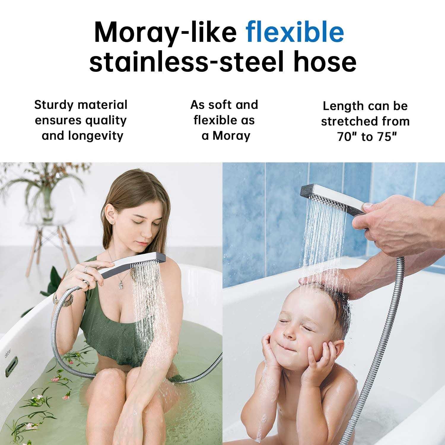 This is a dual shower head set – The rain shower head is 10 inches, which can provide you with a large-range shower The handheld wand makes washing your little kids and pets with ease – If you just want to wash your hair,the handheld helps water saving certainly you can choose use the rainfall shower head and wand separately or together It is worth mentioning that the 13 inches flexible extension arm with a unique design – You can adjust it with any height and angles you need The free spinning locking collar allows you to tighten the extender in a correct position About the 3-way diverter and 71 inches long hose – The diverter convert water from rainfall shower head and handheld conveniently71 inches long hose keeps you away from winding or tangling The hose can be stretched from 70A to 75A, which means you have a longer shower distance – This set is all metal construction which is more duarble