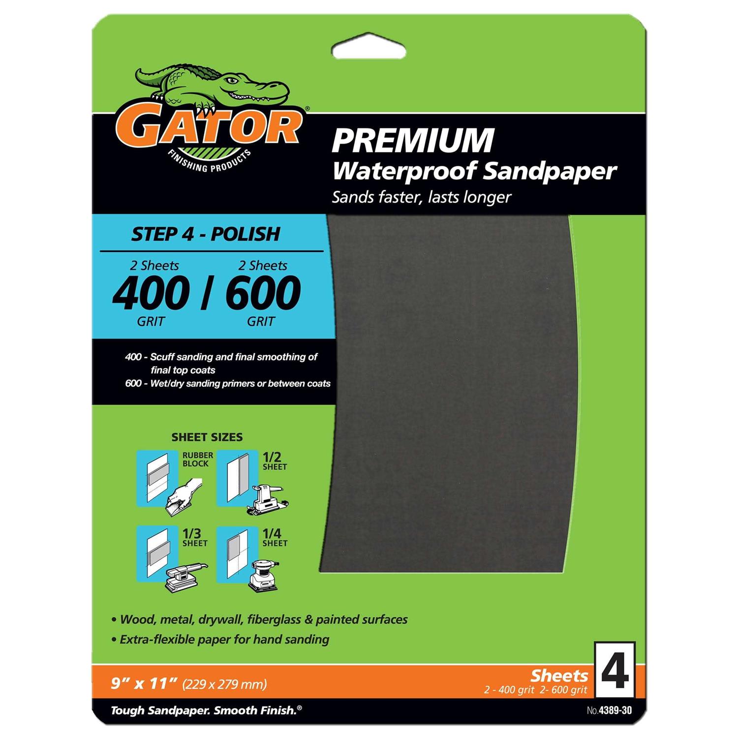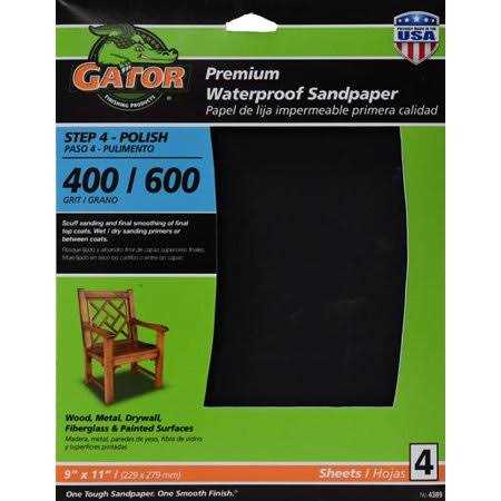 Gator 9-Inch x 11-Inch Waterproof Sanding Sheets are the ideal choice when wet sanding and finishing by hand are required. This package has waterproof sheets and can be used on multiple surfaces. It is impermeable and can be used in between coats or wood stains or paints. This sandpaper sheet works on metal, wood, fiberglass, drywall and painted surfaces. There are many less-known household uses for sandpaper, such as removing rust from tools and opening a stuck jar. 400 grit is best for wet or dry sanding of primer coats before painting. 600 grit sheets are best for sanding between coats of paint and to wet sand primer coats.