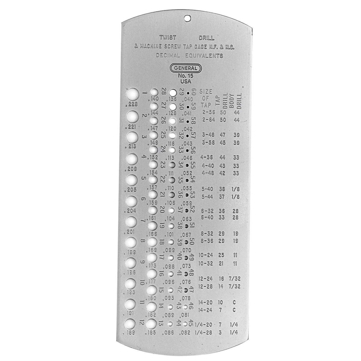 High quality tool that takes the guesswork out of identifying drill bits and screws. Gauge measures drill bits and wire from no. 1 through no. Includes decimal equivalents, tap, tap drill and body drill size chart for machine screw sizes from 2-56 through 1/4-28.