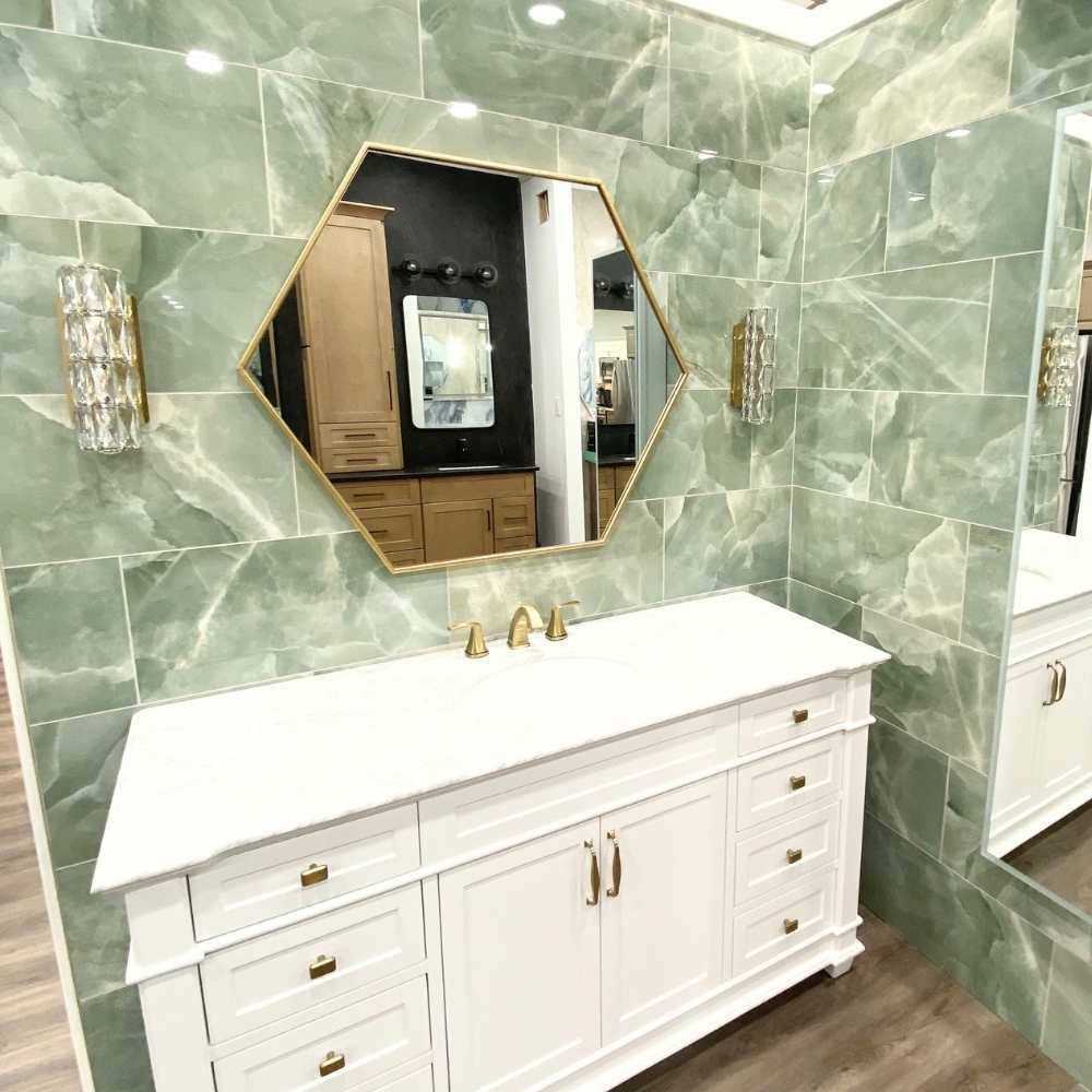 The Tile Life’s Onyx collection is a high-visual, glamorous set of neutral and jewel-toned tiles. Each tile has its own striking veining that creates a watercolored contrast towards the rest of the tile. When put together, these large-format tiles perfectly recreate the look of natural onyx. This collection’s matte and highly polished finishes embolden the potential for a rich and alluring home style. Onyx is available in four colors: jade, blue, grey, and white.