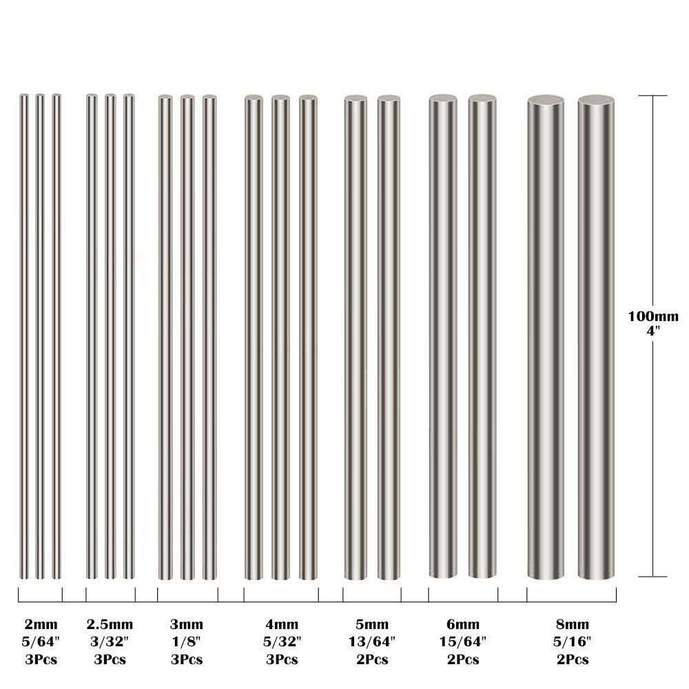 Glarks High quality stainless steel solid round rod lathe bar stock assorted Material:stainless steel Color: Silver Diameter: 2mm, 2.5mm, 3mm, 4mm, 5mm, 6mm, 8mm Length:100mm Feature: — High quality, strong rust-resistant and corrosion-resistant, sturdy and durable — The surface is smooth, easy to shape, no cracks formed Application: Widely used in Gear shaft, motor shaft, short support shaft, sh
