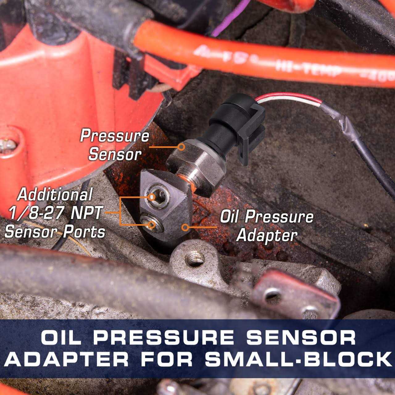 Transmission Oil Pressure by GlowShift. Details:Overview GlowShift Oil Pressure Sensor Thread Adapters compatible with the Chevy Small Block 305 350 make it easy to install an aftermarket oil pressure sensor and an additional sensor. You’ll have enough clearance and will also save time on installation. This oil pressure adapter features a male 1/8-27 NPT thread to attach to the block. (3) Female 1/8-27 NPT threads are set up at (1) 45 degrees and (2) 90 degrees respectively for the oil pressure sensor or other sensors. Oil Pressure Adapter Installation This oil pressure sensor adapter’s design allows for more space when you install the sensors. By connecting to the Small Block you also avoid drilling or making any other major modifications. This oil pressure adapter fitting is machined using premium quality steel with nickel plated zinc and comes with a 1/8-27 NPT Plug if you have an open port.