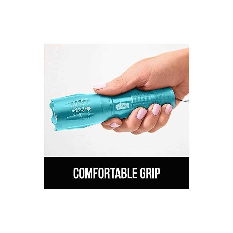 TESTED FOR POWERFUL BRIGHTNESS: featuring more lumens, this LED flashlight will surprise you; compact and lightweight, but ultra bright, it features 345 lumens that reach over 750 feet to shine bright and shed more light; others may claim to have high lumens, but our numbers have been uniquely engineered, tested and confirmed; powered by (3) AAA batteries; batteries not included FIVE MODES: includes a tap button that lets you easily switch between five modes; high, medium, low, strobe and SOS; lightly tap the button to jump between the modes, or firmly push the button to quickly turn on or off without having to cycle through each setting EXTREMELY DURABLE: all weather, ultra durable aluminum alloy flashlight is shock resistant, water resistant, and temperature resistant; the perfect option for any outdoor activity; take it with you hiking, camping, biking and more; flashlight is tough enough to sustain accidental drops up to 3.3 feet as well as water submersions; includes a run time of up to 9.5 hours ADJUSTABLE AND ZOOMABLE FOCUS: the zoomable design includes a wide to narrow beam zoom that makes it easy to focus on objects close or far away; simply twist the flashlight to adjust the zoom COMPACT DESIGN AND TEXTURED ANTI SLIP HANDLE: measuring 5 inches by 1.5 inches by 1.5 inches, flashlight is light and compact for on the go; ergonomic, anti slip textured handle makes it easy to hold and use Meet the ultra-durable, all-weather Gorilla Grip Flashlight! Featuring five modes and an adjustable zoom focus, this flashlight is ultra powerful. Even though it features 345 lumens, it is still light and compact enough to fit inside your pocket. Shock-resistant and water-resistant, with a run time of 9.5 hours, the flashlight will become your new best friend.