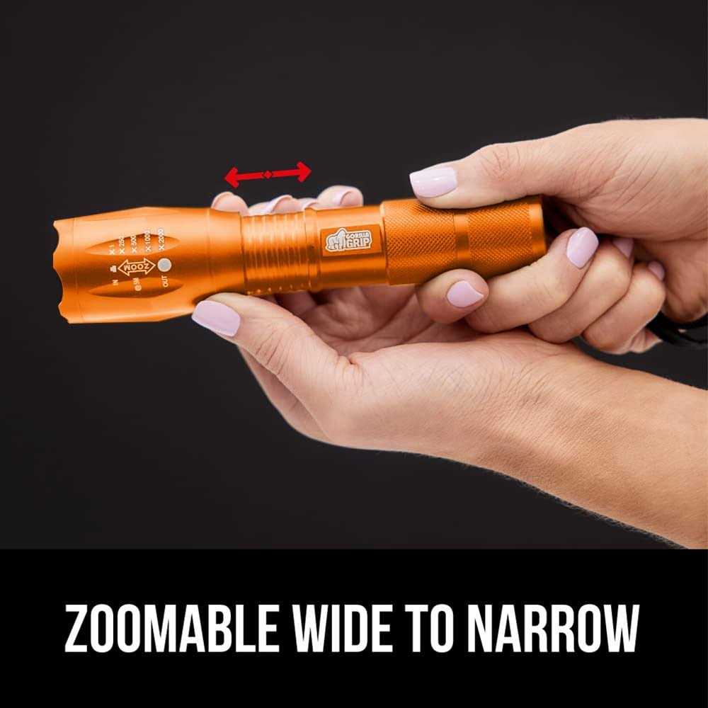 TESTED FOR POWERFUL BRIGHTNESS: featuring more lumens, this LED flashlight will surprise you; compact and lightweight, but ultra bright, it features 345 lumens that reach over 750 feet to shine bright and shed more light; others may claim to have high lumens, but our numbers have been uniquely engineered, tested and confirmed; powered by (3) AAA batteries; batteries not included FIVE MODES: includes a tap button that lets you easily switch between five modes; high, medium, low, strobe and SOS; lightly tap the button to jump between the modes, or firmly push the button to quickly turn on or off without having to cycle through each setting EXTREMELY DURABLE: all weather, ultra durable aluminum alloy flashlight is shock resistant, water resistant, and temperature resistant; the perfect option for any outdoor activity; take it with you hiking, camping, biking and more; flashlight is tough enough to sustain accidental drops up to 3.3 feet as well as water submersions; includes a run time of up to 9.5 hours ADJUSTABLE AND ZOOMABLE FOCUS: the zoomable design includes a wide to narrow beam zoom that makes it easy to focus on objects close or far away; simply twist the flashlight to adjust the zoom COMPACT DESIGN AND TEXTURED ANTI SLIP HANDLE: measuring 5 inches by 1.5 inches by 1.5 inches, flashlight is light and compact for on the go; ergonomic, anti slip textured handle makes it easy to hold and use Meet the ultra-durable, all-weather Gorilla Grip Flashlight! Featuring five modes and an adjustable zoom focus, this flashlight is ultra powerful. Even though it features 345 lumens, it is still light and compact enough to fit inside your pocket. Shock-resistant and water-resistant, with a run time of 9.5 hours, the flashlight will become your new best friend.