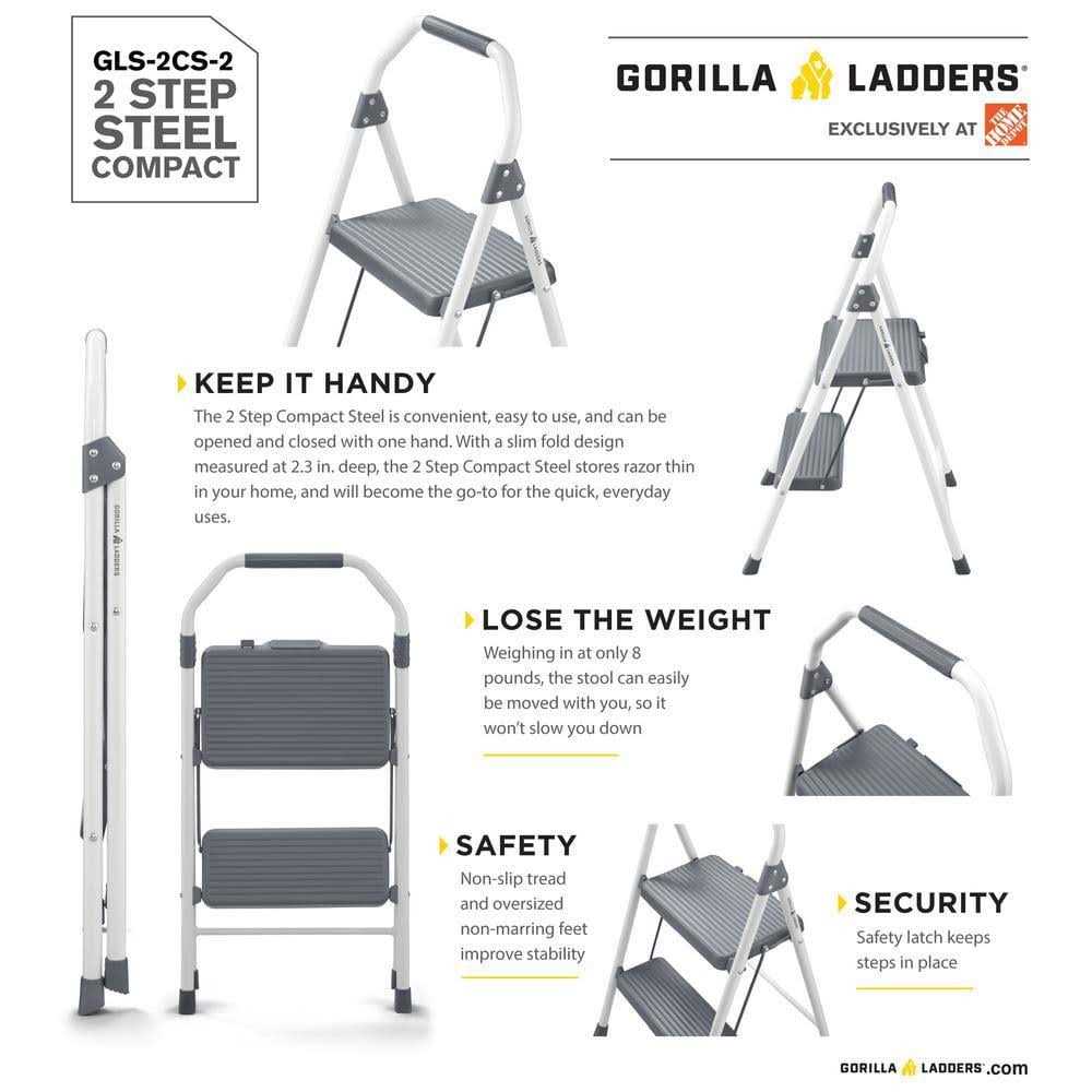 The Gorilla Ladders 2-Step Compact Steel Step Stool is lightweight and folds up extremely thin for easy storage anywhere in your home, office or garage. This step stool features a large, comfortable platform step that automatically locks into place and a convenient hand grip making the stool easy to climb and carry. This durable steel stool is great for multiple projects around the home.