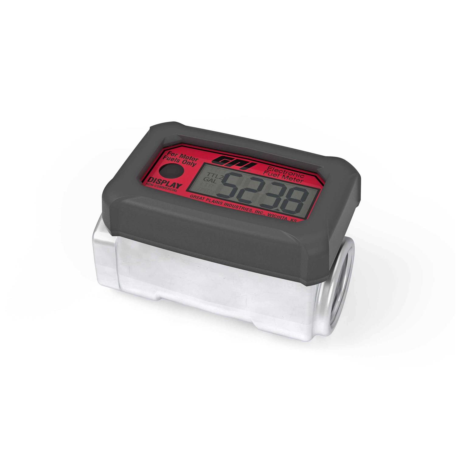 Compact and lightweight, this meter is designed for use on a fuel hose for measuring of pertoleum fuels. It has a flow range of 3 to 30 GPM and has two total readings (accumulative and batch). 1 NPT thread with a 3/4 adapter fittings included. This fuel meter is powered by two AAA batteries (included). The 01A Series meter is for use with gasoline (up to 15% alcohol blends such as E15), diesel fuel (up to 20% biodiesel blends such as B20), biodiesel (B100) and kerosene. Do not use to meter water or chemicals. Do not use for measuring fuel or other liquids into aircraft.