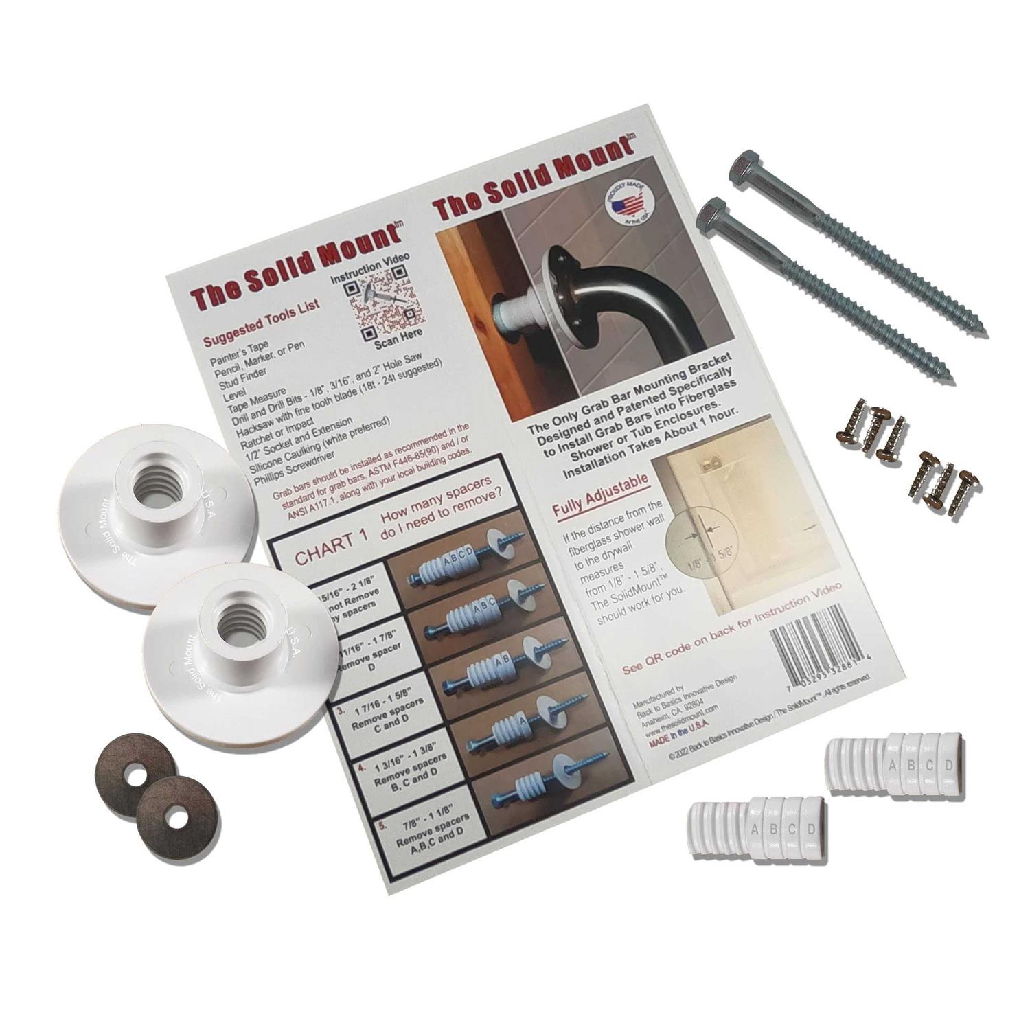 The Solid Mount is an installation kit that allows you to install a grab bar in a Fiberglass Shower. *Grab Bar Not Included* 1 Set Required per grab bar. Use a standard grab bar with a 3″ flange. Installation Time is approximately 1 hour. *Grab Bar Not Included* The Solid Mount only works on wood-framed buildings with Fiberglass or Acrylic Showers. The Installation kit Will Not Work for Tile, Marble, Drywall / Sheetrock, or Buildings with Steel Studs (only works with wood-framed buildings with fiberglass or acrylic showers). With years of meticulous designing and testing, The Solid Mount was developed. The Solid Mount is enrolled in Amazon’s Transparency program to let you know you’re getting an authentic product, not an imitation that has not been tested. “Enhance your shower’s safety with the Solid Mount: the innovative grab bar mounting bracket designed specifically for fiberglass showers.” The Solid Mount grab bar mounting bracket represents a viable solution for enhancing the safety of fiberglass showers. Designed specifically for this type of shower, this innovative mounting bracket allows for the installation of grab bars to prevent falls and accidents in the shower area. By providing additional support and stability, the Solid Mount bracket ensures that users can enjoy a safe and secure shower experience. It is an effective way to minimize the risk of injury, particularly for individuals who may be elderly or have mobility issues. Overall, the Solid Mount grab bar mounting bracket is a valuable investment for anyone seeking to improve the safety and accessibility of their bathroom facilities.