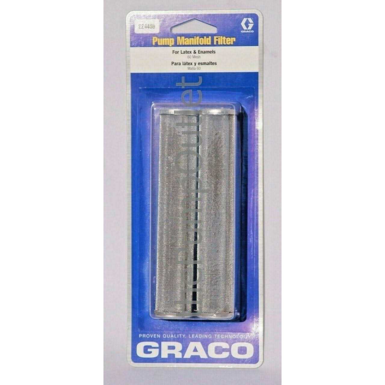Graco 2Pack Standard Long Size Manifold Filter – 224459 This 60 mesh Graco filter is best when used with Latex and Enamels. The ideal tip size used with this Graco pump filter is in the range of .015” to .029”. Manifold Filters filter the paint once more before it enters the hose. Not having the manifold filter can cause damage to your gun and may puncture your hose.