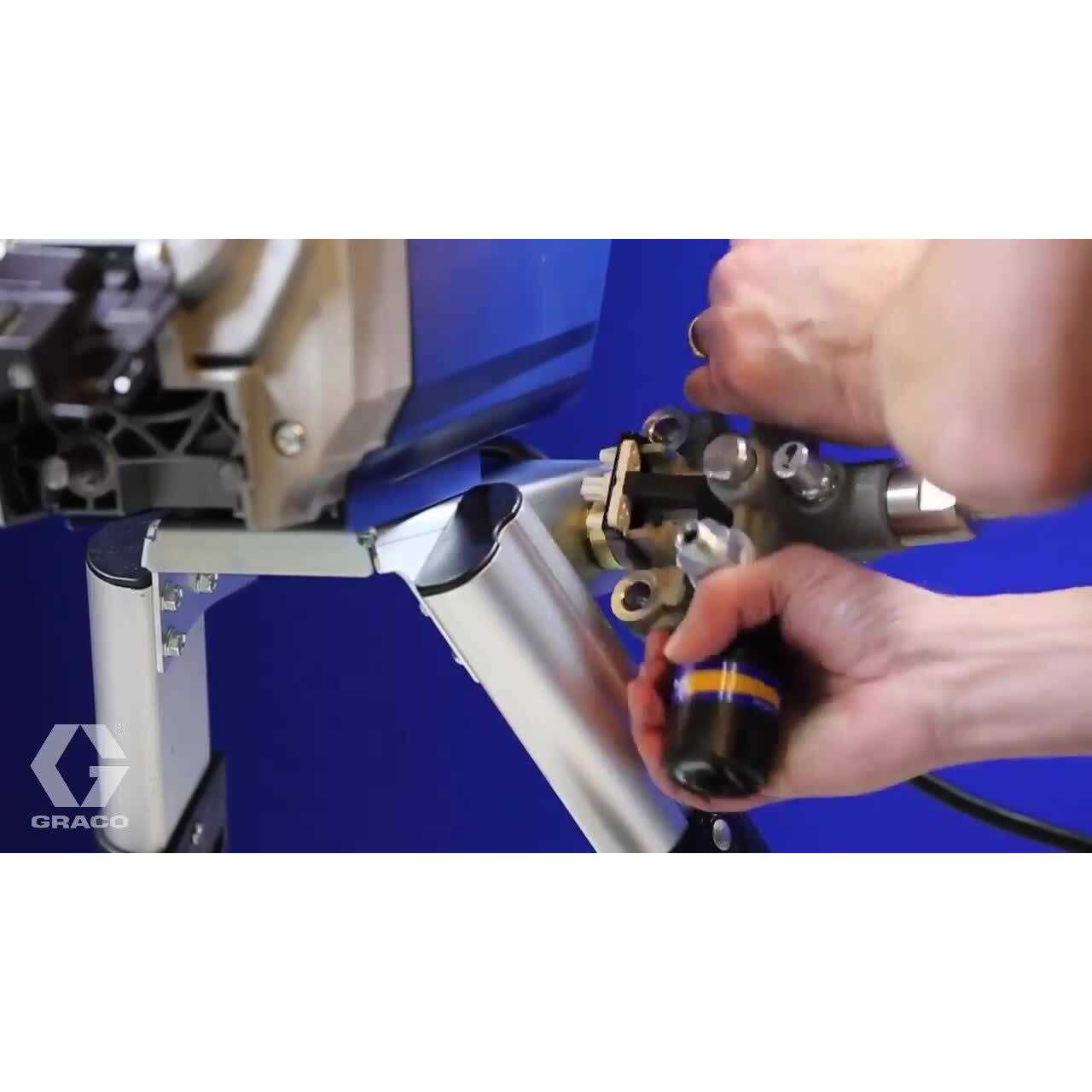 - Insert hex end of the pump into hex tool in the sprayer frame and tighten, slide pump assembly onto the mounting pins.