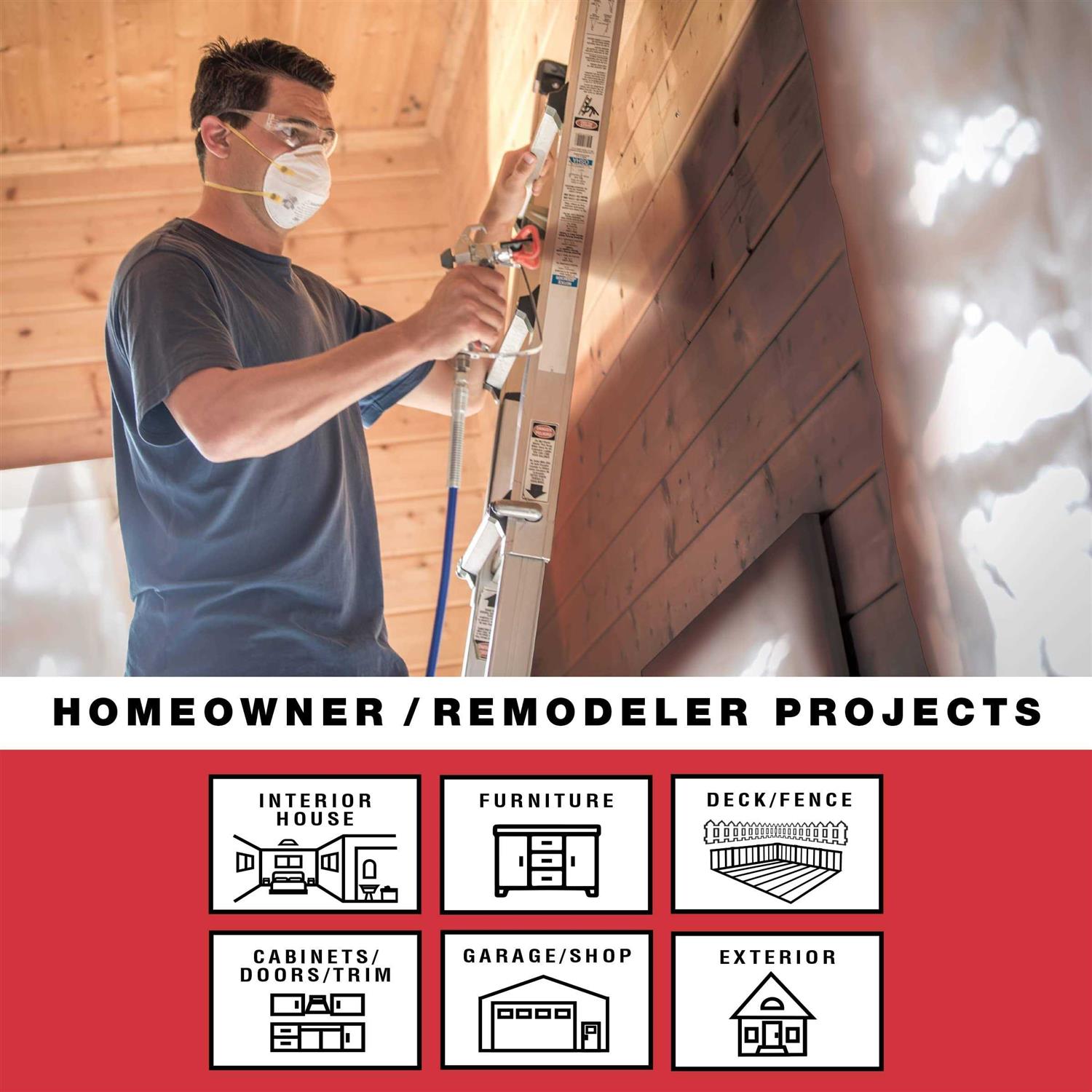 A light duty sprayer designed for homeowners for painting projects around the house. This sprayer is well suited for projects like interior walls, doors, ceilings or exterior work like siding, fences and decks and is also an excellent choice for rolling applications. Conveniently pumps from either a 1 or 5 gal paint container. A one-hand carrying handle makes it easy to move the sprayer around. AutoPrime assures fast priming every time. The Power Flush cleaning adapter simply attaches to a garden hose – making cleanup a breeze. Includes SG2 metal spray gun, 515 RAC IV Spray Tip, 25 ft. of airless paint hose, cleaning adapter, storage fluid and an instructional DVD and quick start-up guide.