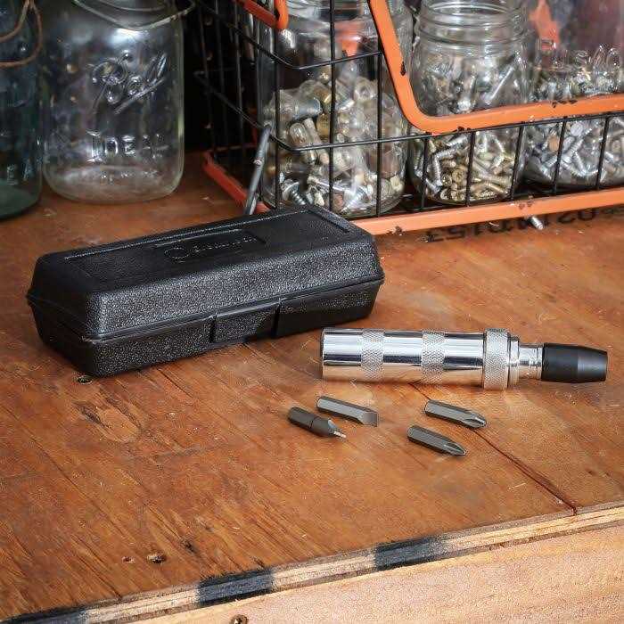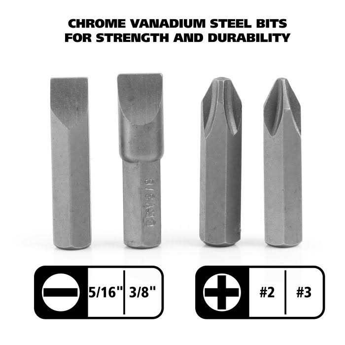 - Complete with Case, knurled drive, and 4 bits: #2, #3 Phillips; 5/16 inch, 3/8 inch slotted