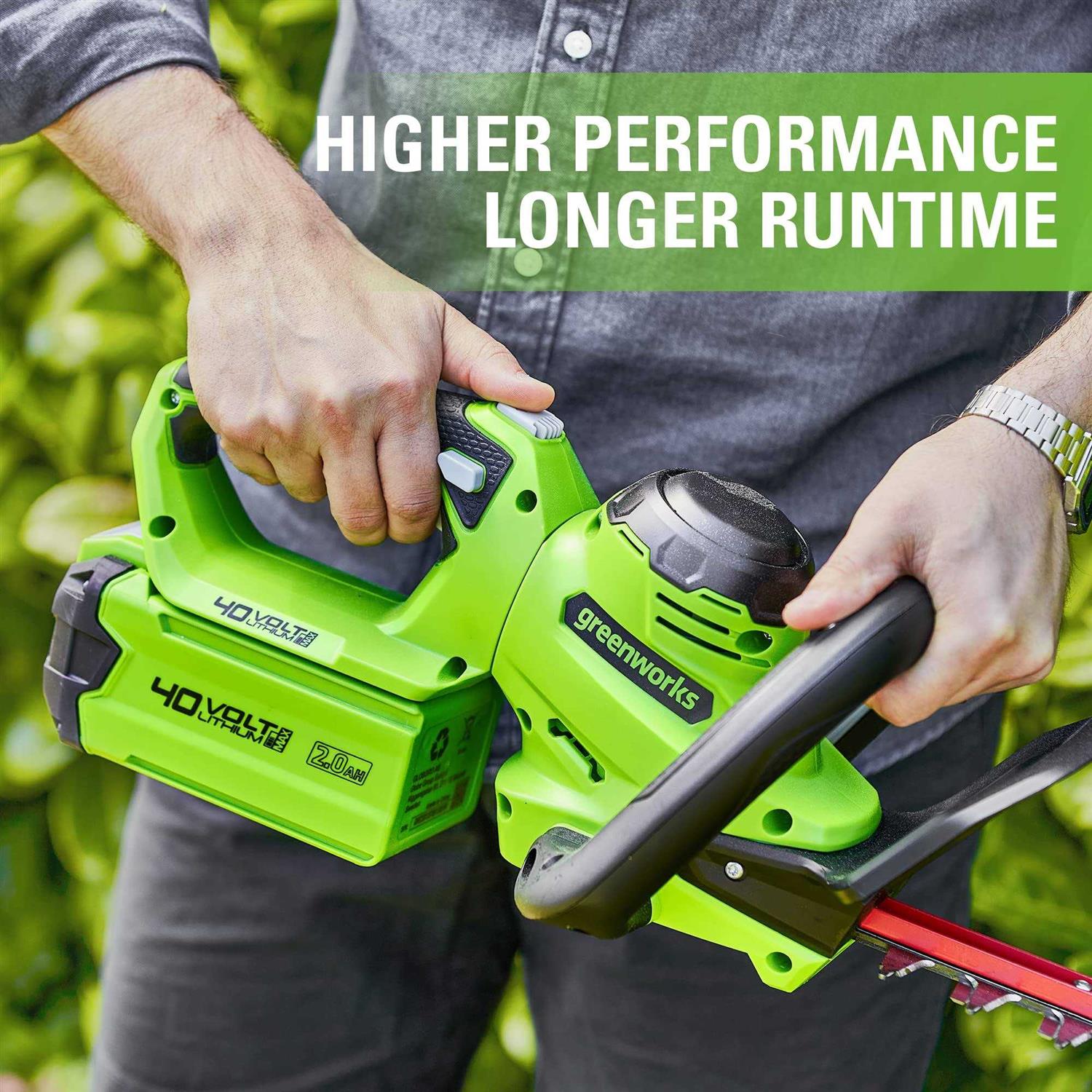 Perfect for yards up to 1/2 acre, Greenworks 40V tools are lightweight, start instantly, and require virtually no maintenance – no gas, no oil, no mess – but still deliver gas-like power. The innovative 40V Lithium-Ion Battery delivers high performance and efficiency among all Greenworks tools. Featuring a simple snap on and off design for ease of use and innovative battery charge level indicator with charging port. Lithium-ion batteries offer no negative memory effect, consistent fade free power throughout its entire run cycle and 3 times longer run time than NiCad batteries. From mowing and edging, to trimming and blowing, you can now complete your yard work with one battery platform that will provide you with the power and performance you need to get the job done quickly and efficiently. Become more efficient when working in your yard by purchasing the Greenworks 40V Lithium-Ion Series of lawn tools. This interchangeable battery platform offers all the tools you need to complete your yard work without sacrificing performance or power. Lithium-Ion batteries can be charged any time with no negative memory effect, so they will be at peak power even after hundreds of charge cycles. Even a few minutes of charging gives you enough full power to finish the job.