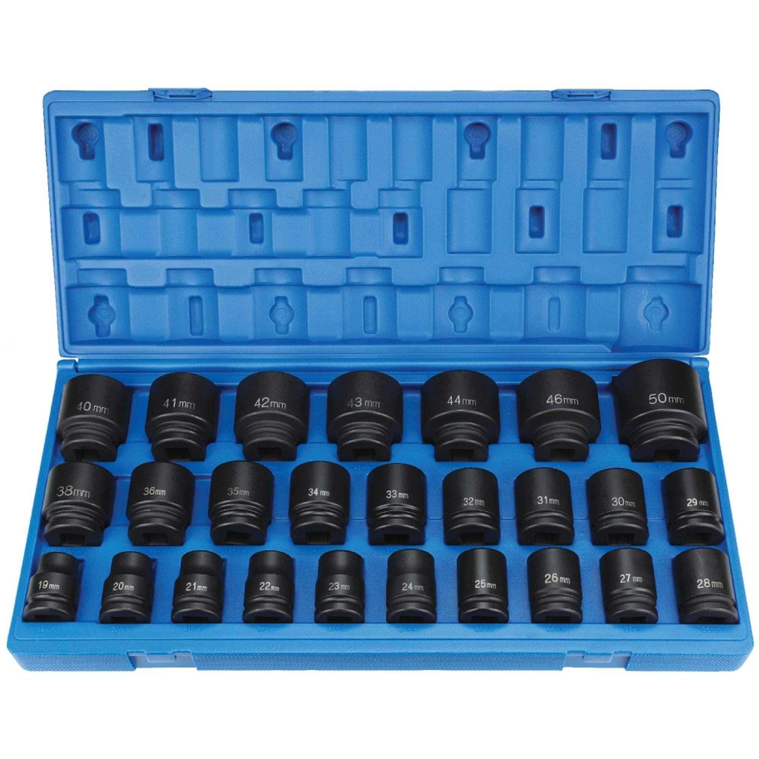 Features and Benefits: 26 Piece Impact Socket Set 3/4″ Drive Includes 6 Point sizes 19mm to 50mm Includes metal storage case Weight 32.92 lbs. Packaged in a metal storage case Our impact sockets grip the fastener across a broader contact area reducing chance of rounding off fasteners. They also allow up to 20% more torque to be applied than on other impact sockets. The shift in pressure allows us to reduce the socket wall thickness increasing access to tight areas. Contains Sizes: 19mm 20mm 21mm 22mm 23mm 24mm 25mm 26mm 27mm 28mm 29mm 30mm 31mm 32mm 33mm 34mm 35mm 36mm 38mm 40mm 41mm 42mm 43mm 44mm 46mm 50mm in standard length. Packaged in a metal case.