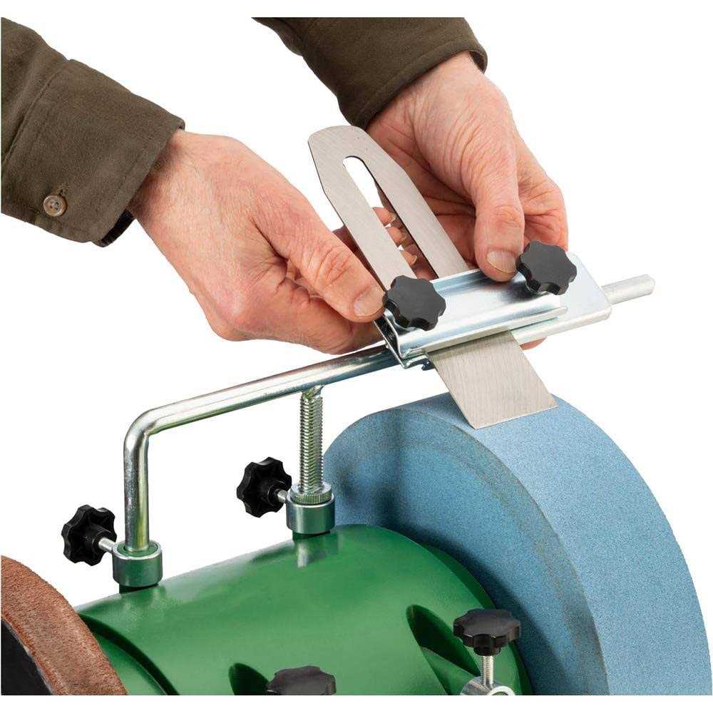 The T32720 10″ Variable-Speed Wet Sharpener is so versatile and simple to use, you’ll wonder why you ever put up with sharpening by hand before. The 2-1/2″ wide, 220-grit aluminum oxide grinding wheel is specially made for wet sharpening. The grinding wheel runs in a water bath to prevent residue buildup on the grinding wheel and keep tools cool while sharpening. The leather stropping wheel helps remove burrs and hones to a final razor edge. The variable speed from 90–150 RPM gives you the ability to control sharpening and stropping at your preferred speed. A tool-holding jig and angle guide are included to allow you to consistently put the right cutting angle on your tools. Start sharpening right out of the box or add the optional accessories for even greater sharpening versatility.