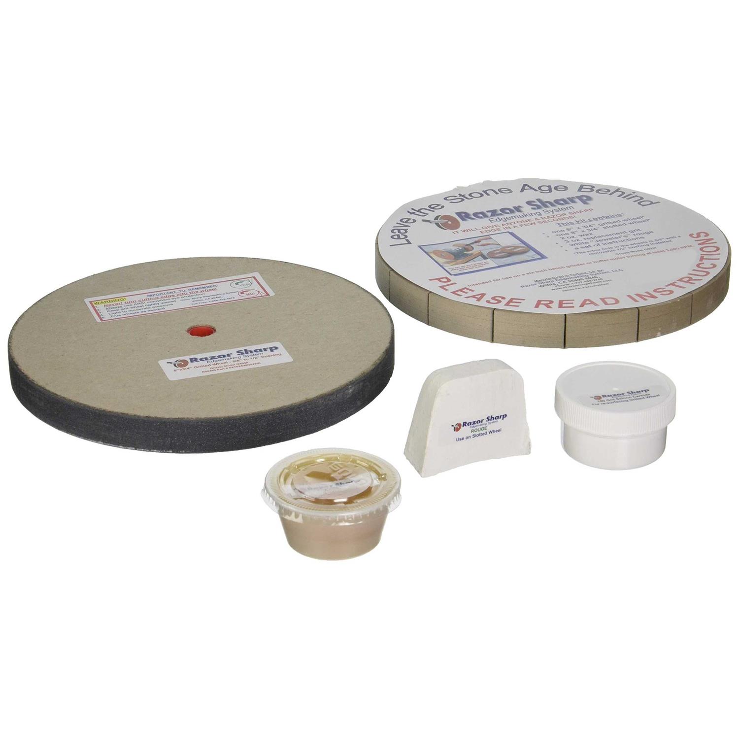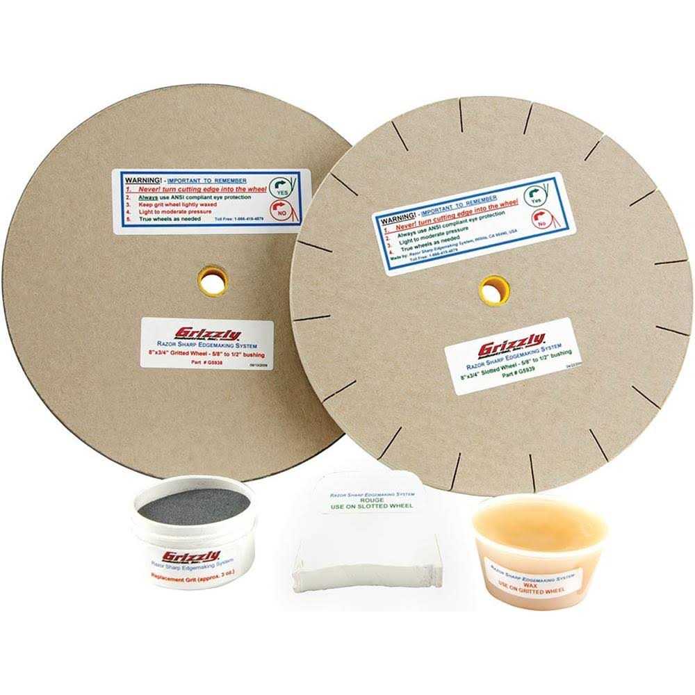 G5937 8″ Razor Sharp Edgemaking SystemTurn your standard 1/2″ or 5/8″ arbor bench grinder into a super sharpening system. Razor Sharp uses two 8″ x 3/4″ wheels – one that’s charged with a special abrasive grit, the other, a slotted wheel that’s used with white rouge – to provide a honing and bench polishing system capable of delivering professional-quality edges on knives, scissors, chisels, punches and other precision-edged tool blades. Kit includes 180 grit silicon carbide sharpening grit, white rouge and conditioning wax. Included removable bushing allows the system to fit 6″ bench grinders and buffers with 1/2″ and 5/8″ arbors. Caution: Never sharpen against rotation.