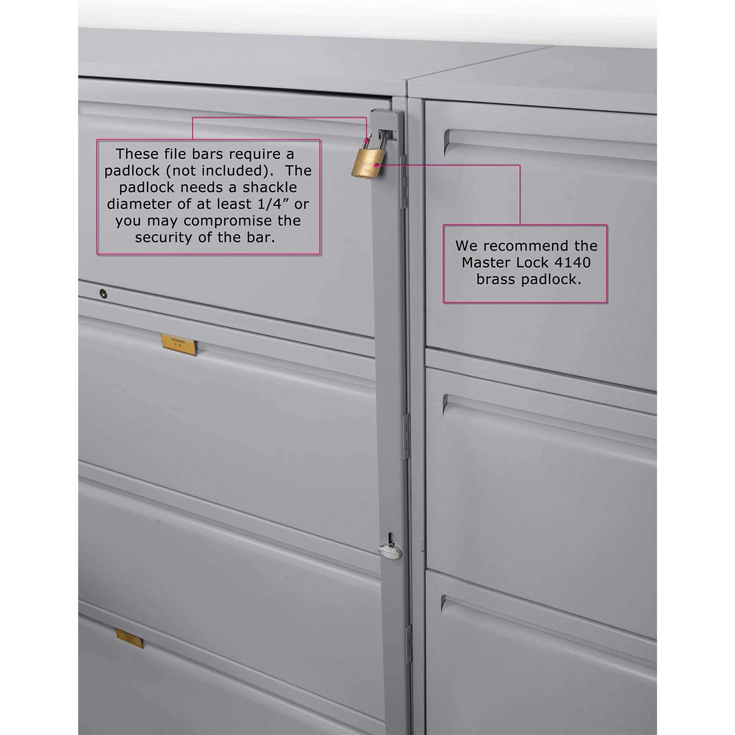 GUARDIANITE 4 DRAWER FILE LOCKING BAR – GRAY This locking bar is an excellent way to secure your files to comply with HIPAA, Sarbanes-Oxley, PCI Compliance, and other privacy regulations. It doesn’t matter if you are a big company, a small company, or just need to secure your files at home from prying eyes, this bar will do the job. This gray Guardianite 4- drawer locking bar is 46″ long. Measure the height of your filing cabinet to confirm th