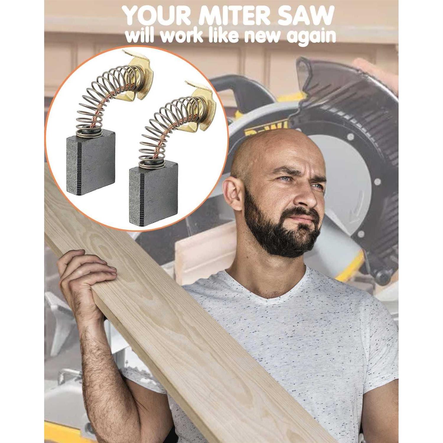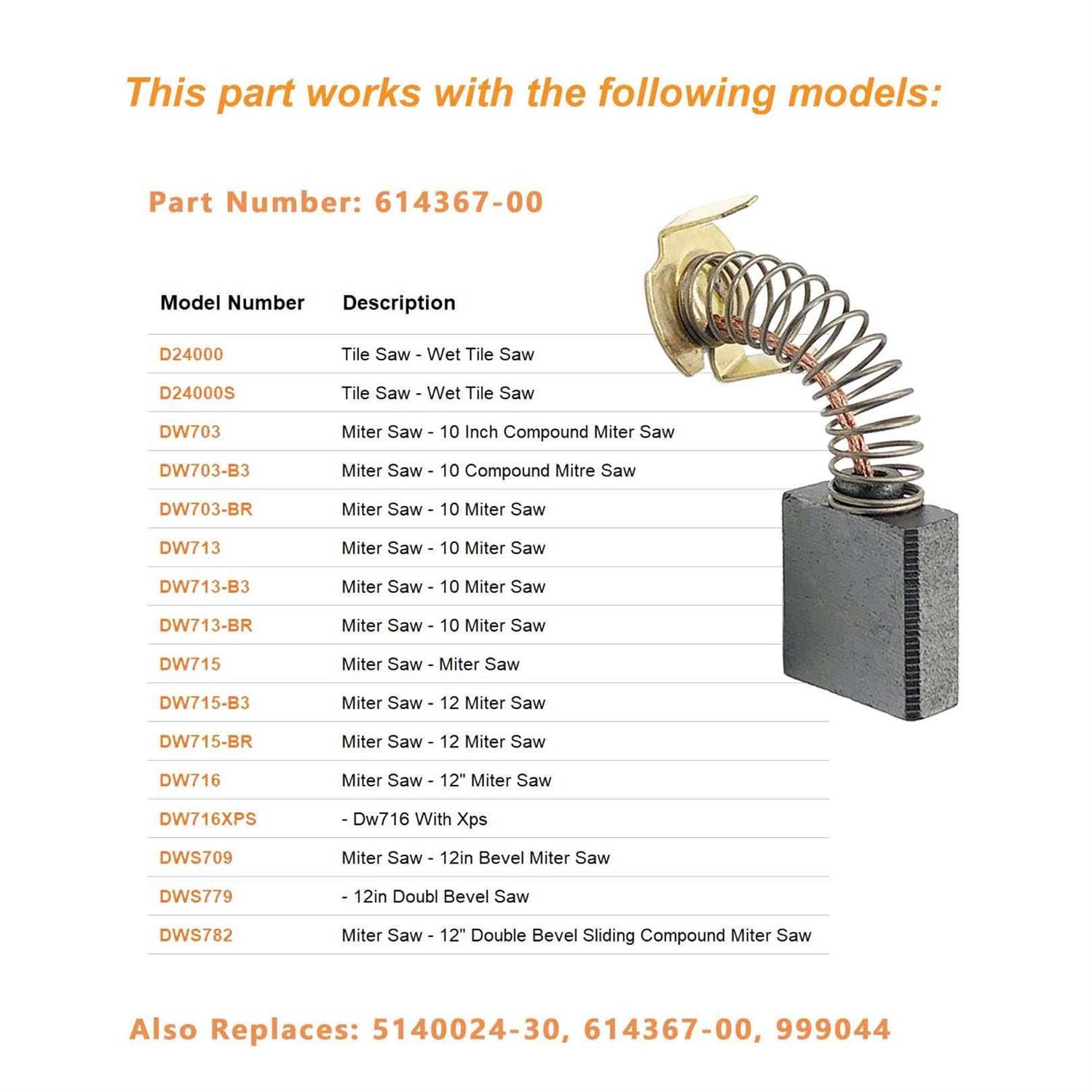 【Carbon Brush Replacement】 Part number: 614367-00, Also Replaces 5140024-30 / 0502025007 / 999044. 【Compatible with Machines】 D24000 Type 1, D24000 Type 2, D24000S Type 1, DW703 Type 3, DW703-B3 Type 3, DW703-BR Type 3, DW713 Type 1, DW713 Type 2, DW713-B3 Type 1, DW713-B3 Type 2, DW713-BR Type 1, DW713-BR Type 2, DW715 Type 3, DW715-B3 Type 3, DW715-BR Type 3, DW716 Type 20, DW716XPS Type 20, DWS709 Type 20, DWS779 Type 20, DWS780 Type 20, DWS782 Type 20, BTS21 10″” Table Saw 【Easy Repair Fix】 Worn brushes are a common causes of intermittent motor function, reduced electric braking and reduced motor power, Replacing brushes can fix a motor that’s operating intermittently. 【Warm tip】Worn brushes can cause the motor to smoke or spark and should be replaced if it occurs. When replacing carbon brushes, be sure to inspect your armature for burns, cracks, or other damage which can indicate larger motor problems that may not be solved by replacing the carbon brushes. Miter Saw br / DWS709 Type 20 12in Bevel Miter Saw br / DWS779 Type 20 12in Doubl Bevel Saw br / DWS780 Type 20 br / DWS782 Type 20 12″” Double Bevel Sliding Compound Miter Saw br / br / BTS20R-1 10″” Table Saw br / BTS21 10″” Table Saw br / BTS16 10″” Table Saw br / BTS211 10″” Table Saw br / RTS31 10 In. Table Saw br / br / R4516 Table Saw br / R4513 Table Saw br / R4092 10″” Table Saw br / R45171 Table Saw 7-26-18 (Rev:05) br / R45171NS Table Saw 5-4-18 (Rev:01) br / R45171T Table Saw br / br / br / Note: br / 1. Worn brushes are a common causes of intermittent motor function, reduced electric braking and reduced motor power. Because carbon brushes are a wear item, they are one of the most frequently replaced power tool parts. br / 2. Worn brushes can cause the motor to smoke or spark and should be replaced if it occurs. br / 3. When replacing carbon brushes, be sure to inspect your armature for burns, cracks, or other damage which can indicate larger motor problems that may not be solved by replacing the carbon brushes br / br / Package Included: br / 4 x Carbon Brushes”