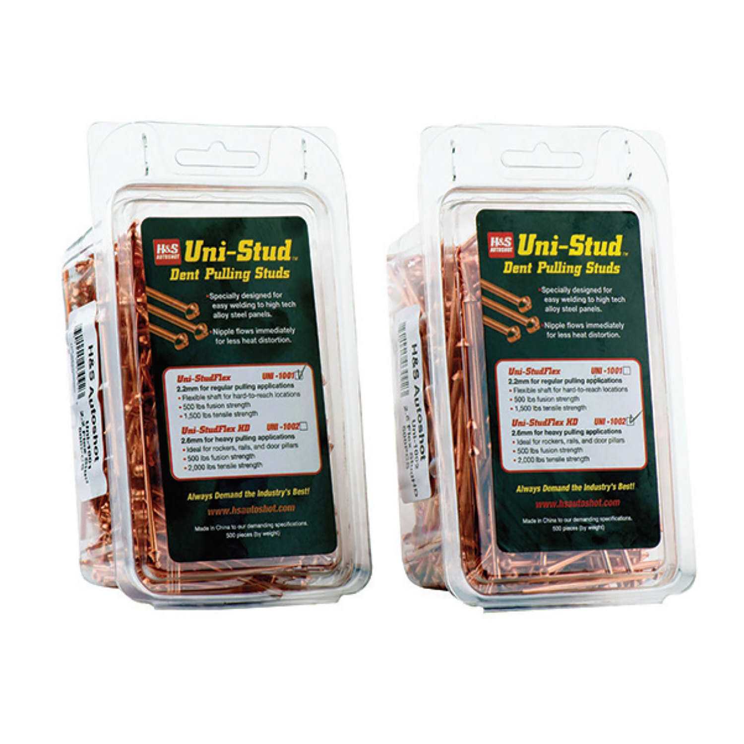 The H&S Autoshot HSAUNI-1001 steel stud works well on any automotive steel requiring stud welding as part of the repair. This unique design allows for superior welding on the newer high strength lightweight steel, common in today’s collision repair market. The new tip design allows for a stronger and easier weld process. The 1001 Flexpert Welding Studs are the most popular stud sold today. They are 2.2 mm, copper coated, and specially designed for easy welding and easy removal after the pulling is complete. The shafts are strong, yet flexible. This is the preferred stud for use with slide hammers.