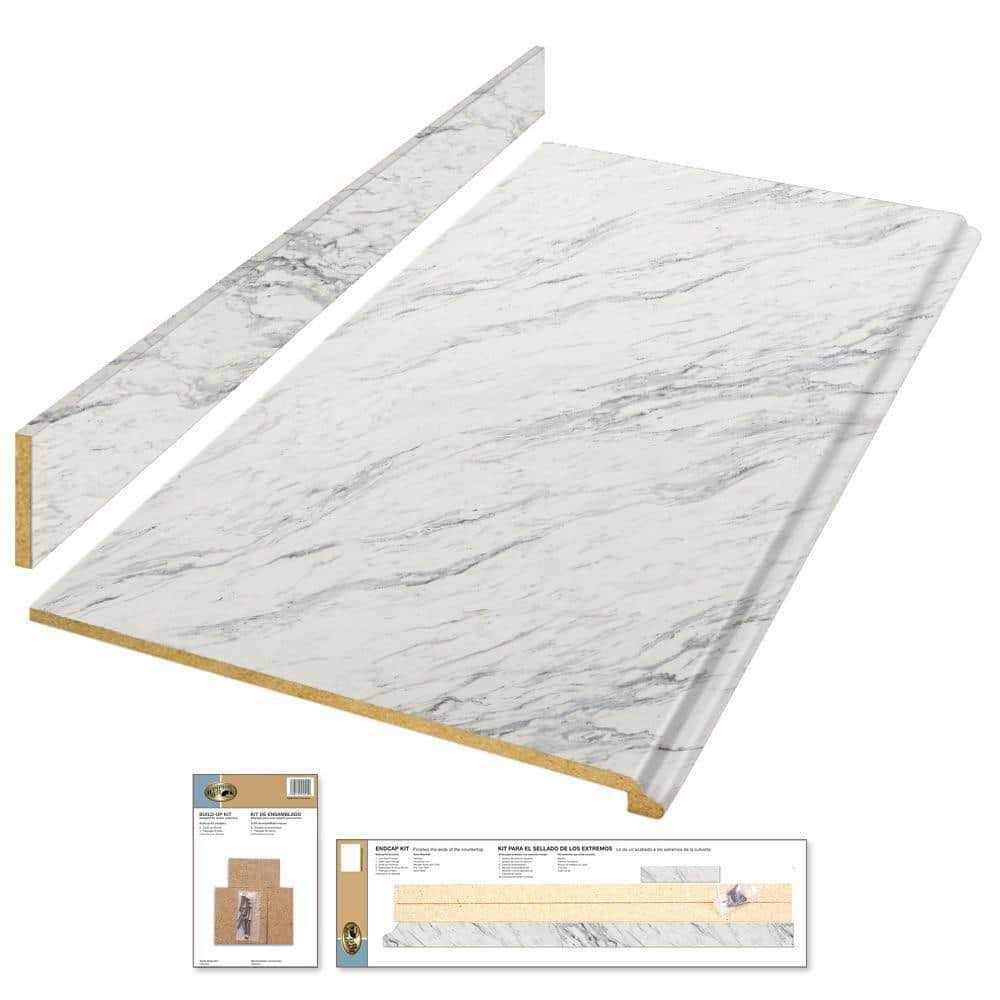 - Kit includes one 6 ft. laminate countertop in Calcutta Marble with Valencia edge, one 3 in. loose backsplash, 1 endcap kit, and 1 build-up kit