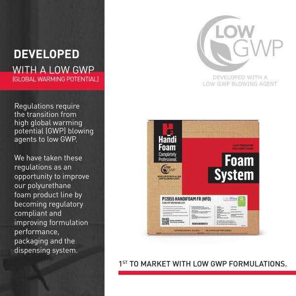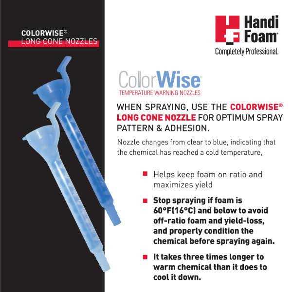 Built for the pros, the HandiFoam FR (HFO) is designed to fill and insulate large voids and surfaces. HandiFoam’s excellent adhesion properties create a continuous air barrier which completes the building envelope, resulting in improved indoor air quality and lower heating and cooling costs. Designed to be used with the Handi-Gun and the patented ColorWise Temperature Warning nozzles to effectively seal and insulate projects of all sizes. The ColorWise Temperature Warning nozzles change from clear to blue as a visual indication that the foam is too cold and should not be dispensed until properly conditioned. To avoid off-ratio foam and yield-loss, properly condition the chemical before spraying. This product is formulated utilizing an HFO blowing agent which is part of HandiFoam’s ongoing commitment to developing foam chemistries with lower global warming impact and enhanced product performance.HandiFoam is an industry-leading brand that delivers low-pressure one- and two-component polyurethane foam sealants, adhesives, pour-in-place and spray foams. HandiFoam is built on the foundation of innovations that improve.