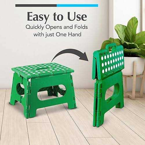 - The lightweight, but sturdy folding step stool is easy to use because it opens with one flip of the hand.