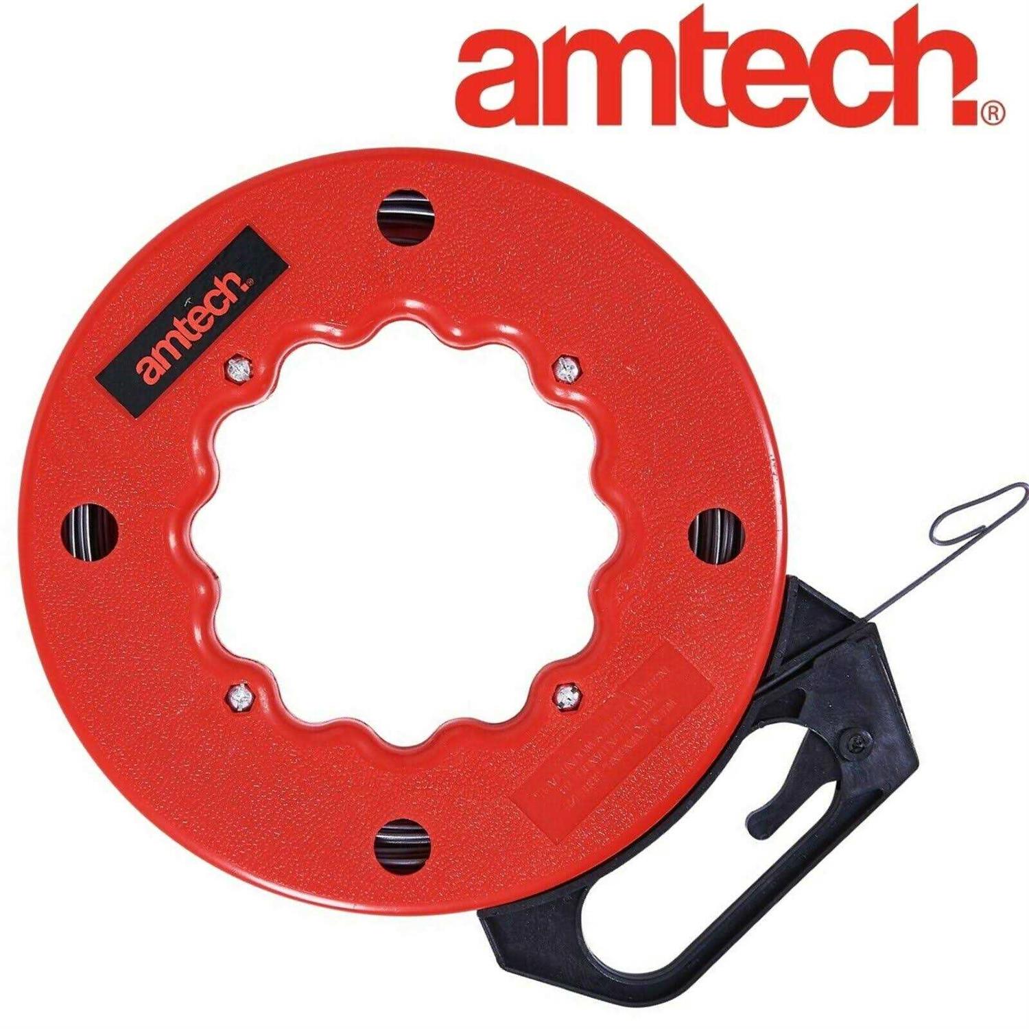 This spring-steel fish tape makes it easy to thread cables and wires through drywall, conduit or insulation. Simply guide the fish tape through the narrow opening, attach wires to the pulling loop and pull the wires to the new location smoothly and efficiently. The reel winds up and stores excess fish tape as the wire is pulled, and a built-in thumb lock holds the wire in place.