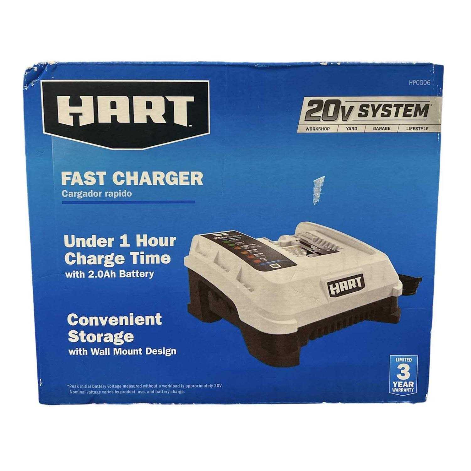 How fast is HARTs 20V Fast Charger? Pretty fast. It can charge all your 1.5Ah and 2.0Ah HART 20V Lithium-ion Batteries in under 1 hour. The charger easily attaches to the battery. Just plug in the charger, snap in the battery and the light will blink green when charging begins. It also has an LED indicator light that shows the status as the battery is being charged. When charging is complete, the light will be solid green. Its also lightweight (just 1.6 lbs.) and convenient to store with a wall mount design built-in. Other features include advanced charging action for battery protection and an extended life. Includes Fast Charger and operators manual.