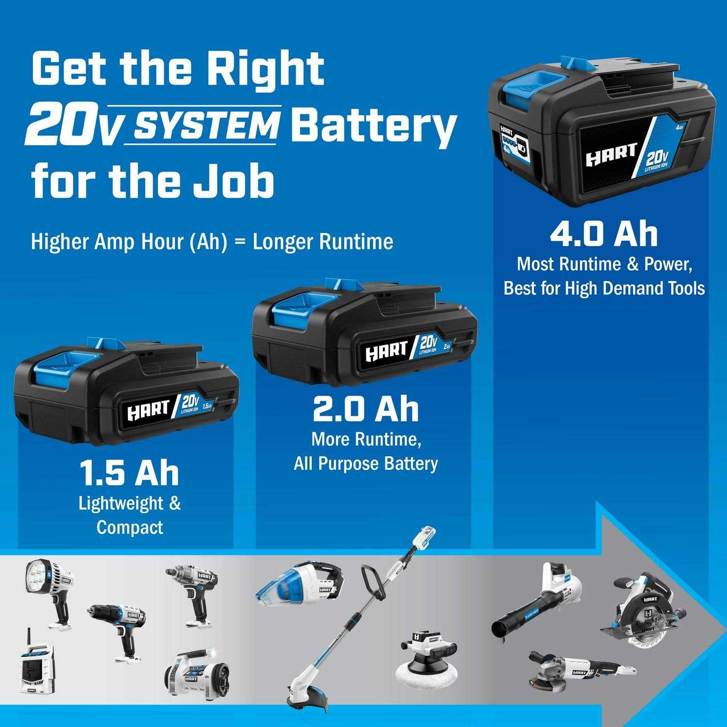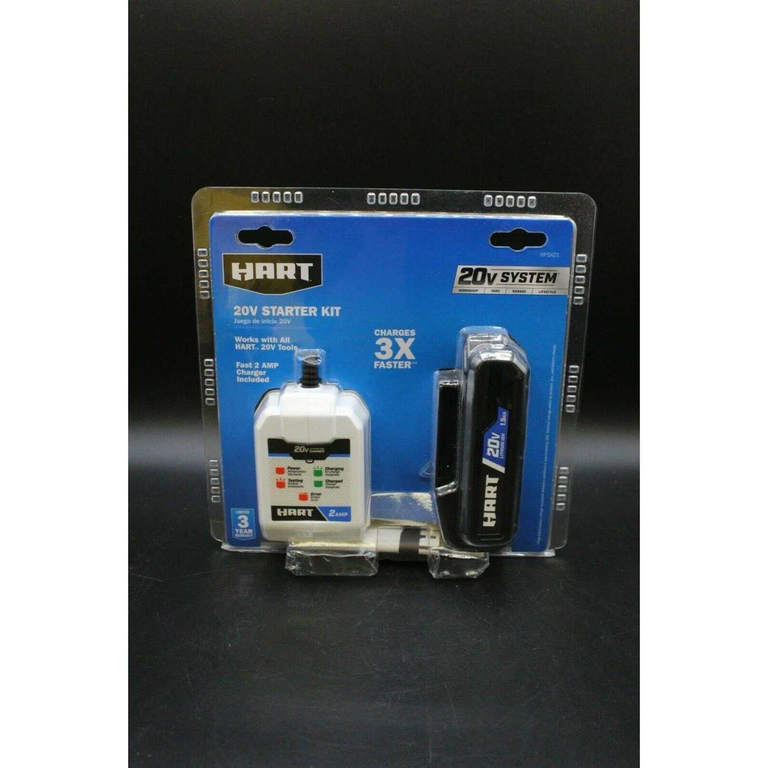 The HART 20V 1.5 Ah Starter Kit is an amazing way to start, or add to, any HART tool collection. The included HART 20V 1.5 Ah Lithium-Ion battery is designed to be both lightweight and compact to provide long-lasting and fade-free power while reducing user fatigue. The included 2 AMP fast charger charges any HART Lithium-Ion battery at 3x the rate of the standard 0.5 AMP charger included in many drill kits. Whether you are maintaining your yard with HART outdoor tools, cleaning and maintaining your car with HART automotive tools or keeping cool and entertaining with HART lifestyle tools, the HART 20V 1.5 Ah Starter Kit is there to provide the power you need when you need it in a lightweight and compact form.