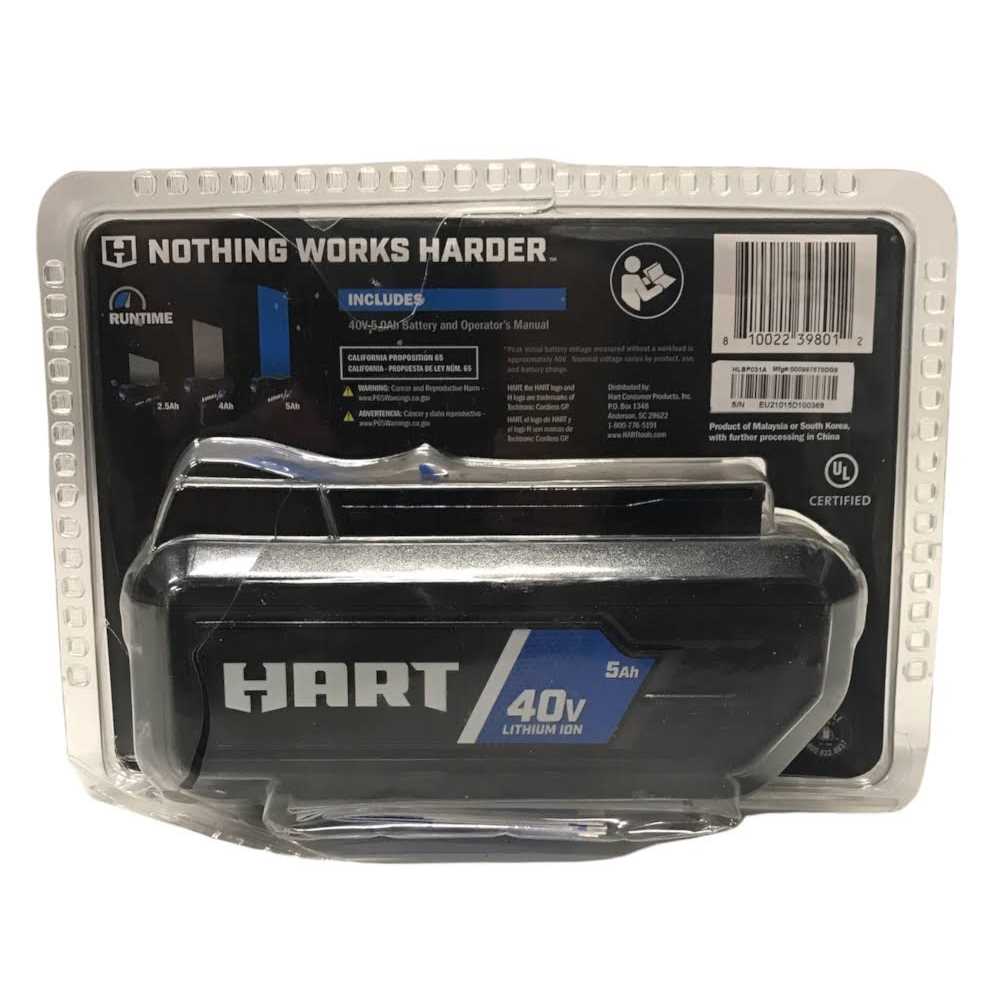 Expand your 40V collection with this 5.0Ah battery. This 5.0Ah batterygets you back to work faster It is also compatible with all HART 40V outdoor tools and features lithium-ion power for fade-free power for longer-lasting performance. This battery works with all HART 40V tools for ultimate compatibility. Get ALL POWER, NO GAS.