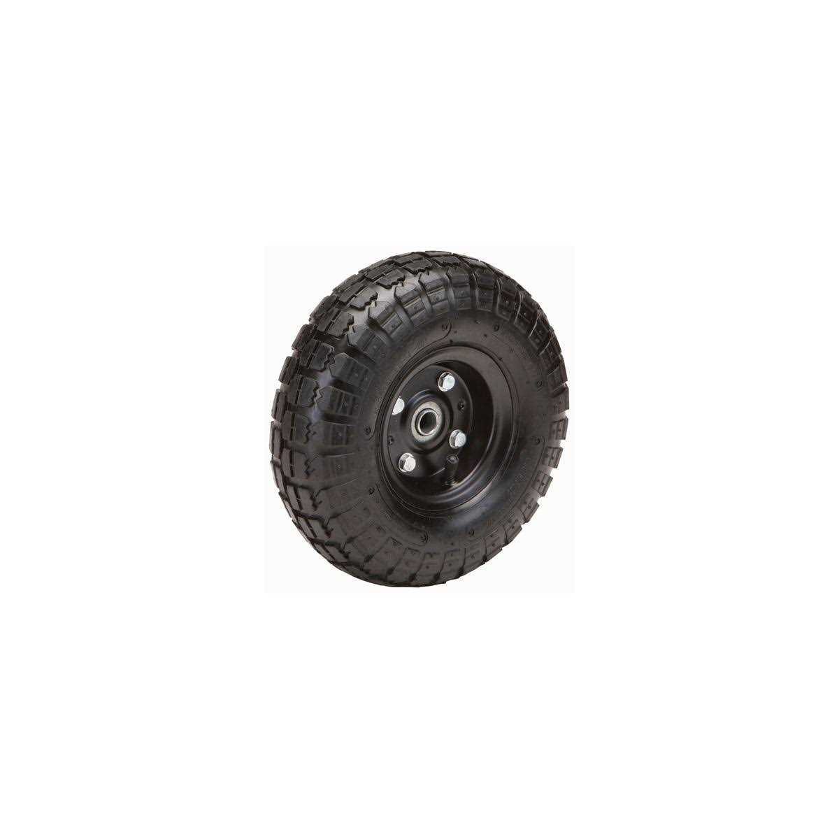 This pneumatic tire is the perfect replacement for wagons, hand trucks and yard trailers. The tire features a heavy duty steel hub with a powder coat finish for durability and a knobby all-terrain tread for lawn and garden applications. This quality rubber tire is a great backup for any landscaper or gardener.