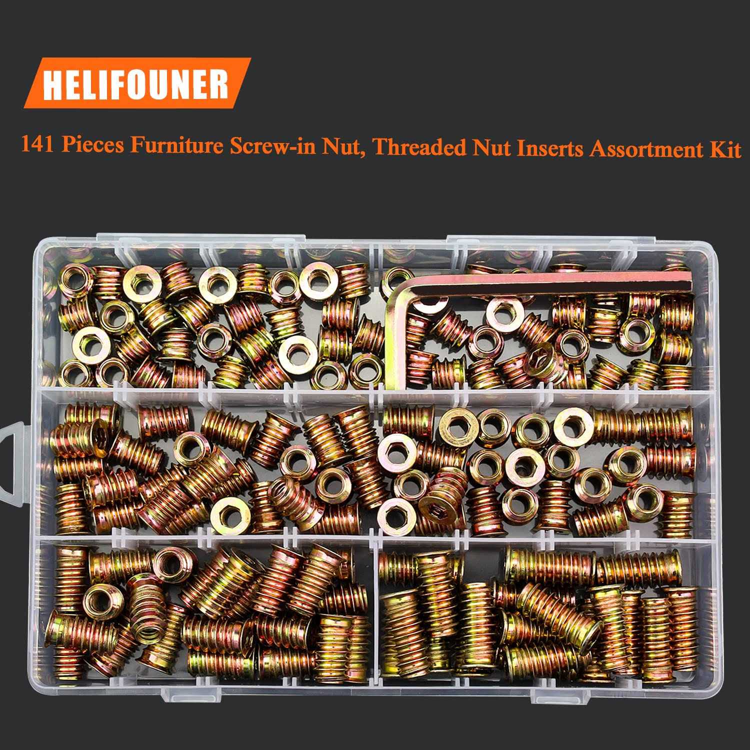 【Detailed Dimensions】1/4″-20 x 10mm/15mm/20mm/25mm, 5/16″-18 x 13mm/15mm/20mm/25mm, 8 sizes commonly used threaded inserts in a plastic case, different sizes can satisfy your different needs, coarse thread, fit standard 1/4 20 screws bolts and 5/16 18 screws bolts perfectly. 【Color Zinc Plated Steel】Made of high quality carbon steel, color zinc plated on the surface which have good corrosion resistance in bad environment like high temperature, high hardness and perfect wear resistance, standard internal hex socket, without burr, smooth, non-slip, which can ensure long time using. 【Easy To Install】You can drill a hole by using a 9.5mm /12mm drill bit, ensure a precise 90 degree angle for inserting the threaded inserts, then you need to screw the inserts into the 9.5mm /12mm holes by using our hex wrench. Make sure you countersink the hole to head size before you insert the threaded sleeve, fit standard 1/4 20, 5/16 18 screws bolts perfectly. 【Threaded Inserts Assortment Kit】Total 150 pieces 8 sizes threaded inserts are packed in a durable transparent box with label for you. It is easy to distinguish the size of the product, you can choose the suitable one to use in your wood furniture. Our threaded inserts have standard internal hex socket, without burr, smooth, non-slip. 【Wide Applications】You can use our threaded inserts to repair file cabinets and chair leg, you can also use them on head board and foot board of wood furniture. Widely used for soft woods of pine, plywood, fiberboard, etc, work perfectly on the furniture combination, you just need to drill a hole that the size of the body into the wood for the threaded inserts. br 【Specifications:】 /b br – Thread Type: 1/4″-20, 5/16″-18 br – Package Quantity: 150 Pieces br – Color: Color zinc, as picture show br – Fit for standard 1/4 20, 5/16 18 screws bolts br – Type: 1/4 20, 5/16-18 Wood Threaded Inserts br – Material: High Quality Zinc Plated Carbon Steel br – Sizes: 1/4″-20 x 10mm/15mm/20mm/25mm, 5/16″-18 x 13mm/15mm/20mm/25mm br br 【Features:】 /b br – Material: Made of high quality carbon steel, color zinc plated on the surface which have good corrosion resistance in bad environment like high temperature, high hardness and perfect wear resistance, standard internal hex socket, without burr, smooth, non-slip, which can ensure long time using. br – Easy to install, HELIFOUNER threaded Inserts are best for composite materials, soft wood, plywood and hardwood, you can drill a hole by using a 9.5mm /12mm drill bit, ensure a precise 90 degree angle for inserting the threaded inserts, then you need to screw the inserts into the 9.5mm /12mm holes by using our hex wrench. br – Total 150 pieces 8 sizes threaded inserts are packed in a durable transparent box with label for you.