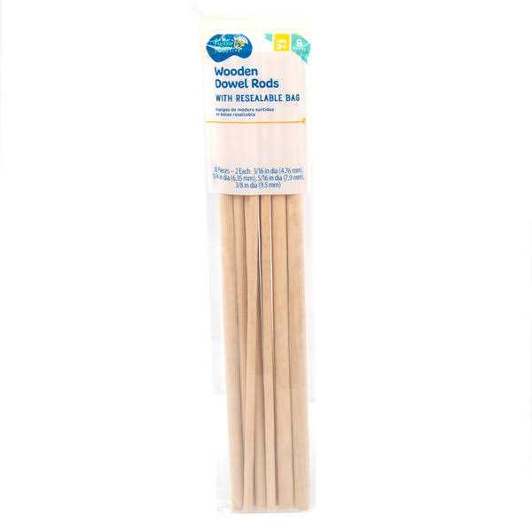 With 4 different sizes to choose from, wood dowels are a must-have material for a variety of arts and crafts or DIY projects, and this set comes with a convenient resealable bag for easy storage and clean-up. Explore your creativity and make spinning pinwheels, soaring towers, and stunning 3D models. Turn crafted creatures or stuffed animals into a puppet by attaching wood dowels to their limbs. Make bright signs reminding the Easter Bunny to Stop Here! using the dowel as a handle. These wood dowels can be painted any bright color to bring your creations to life! Visit the Craft Project Ideas website for creative inspiration. Recommended for crafters ages 3 and up.