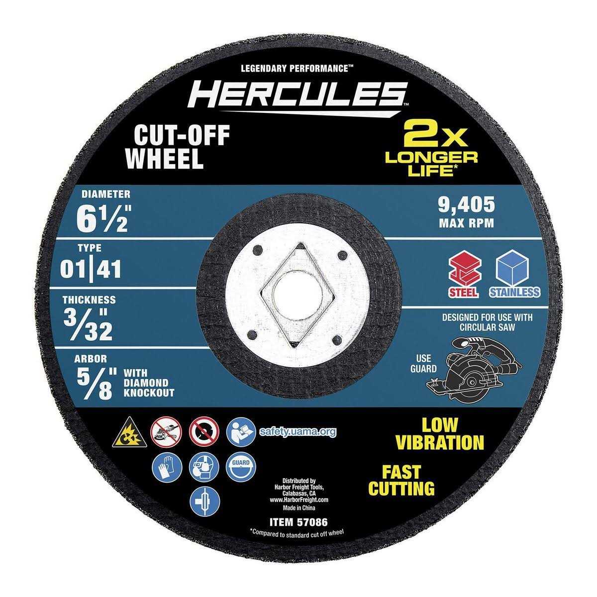 HERCULES cut-off wheels are constructed with premium abrasive grains and a high-quality resin bond that delivers up to 2X longer life. * Ideal for use in a wide variety of metalworking cutting applications, these cut-off wheels are designed to deliver super-fast, clean cuts. Designed for use with circular saws.