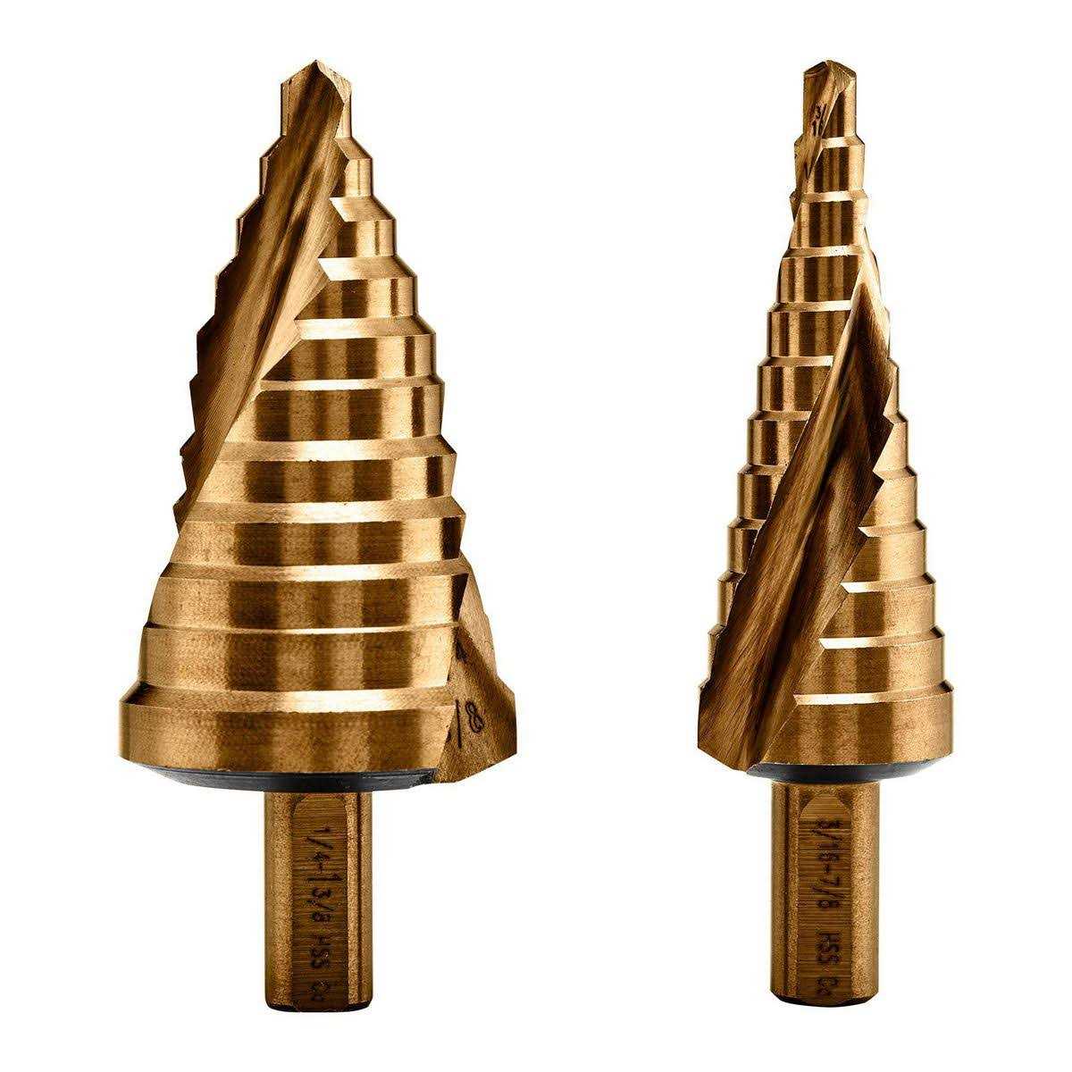 HERCULES super-hard cobalt alloy step bits stand up to heat and tough materials to stay sharper longer. The step drill bits automatically deburr holes as you drill and the spiral-flute design provides faster, smoother cutting. StarterPoint No-Walk Fast Start provides quick clean holes in materials from wood to stainless steel.