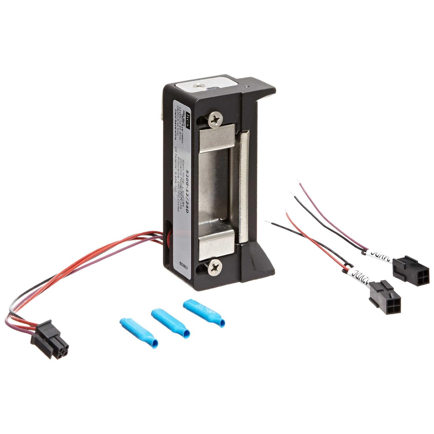 In-frame horizontal adjustment – Specially designed electric strike to make installation as easy as possible. After installation of the strike, the horizontal adjustment feature allows the installer to adjust the electric strike opening in order to accommodate the horizontal position of the latchbolt. At a glance, this electric strike not only has in frame horizontal adjustment but has field selectable fail secure/fail safe, an internally mounted solenoid, plug-in connector, trim enhancer and is tamper resistant. This non-handed electric strike is for use with cylindrical locksets and can accommodate – latch bolts ( with door gap). The strike body is 1-3/16 deep, with static strength of 1,500 lbs and dynamic strength of 70ft./lbs. This electric strike can accommodate steel, aluminum and wood frames. This electric strike is also dual voltage, 12 or 24 VDC/AC. 24 Amps at 12 VDC, 12 Amps at 24 VDC, DC is continuous duty and AC is intermittent duty. This easy to install, uniquely adjustable 5200 Series Electric Strike Kit is the perfect fit for a wide variety of applications. The kit includes 5200 electric strike body, trim enhancer(with screws), 12 and 24 volt pigtails, and detailed installation instructions.