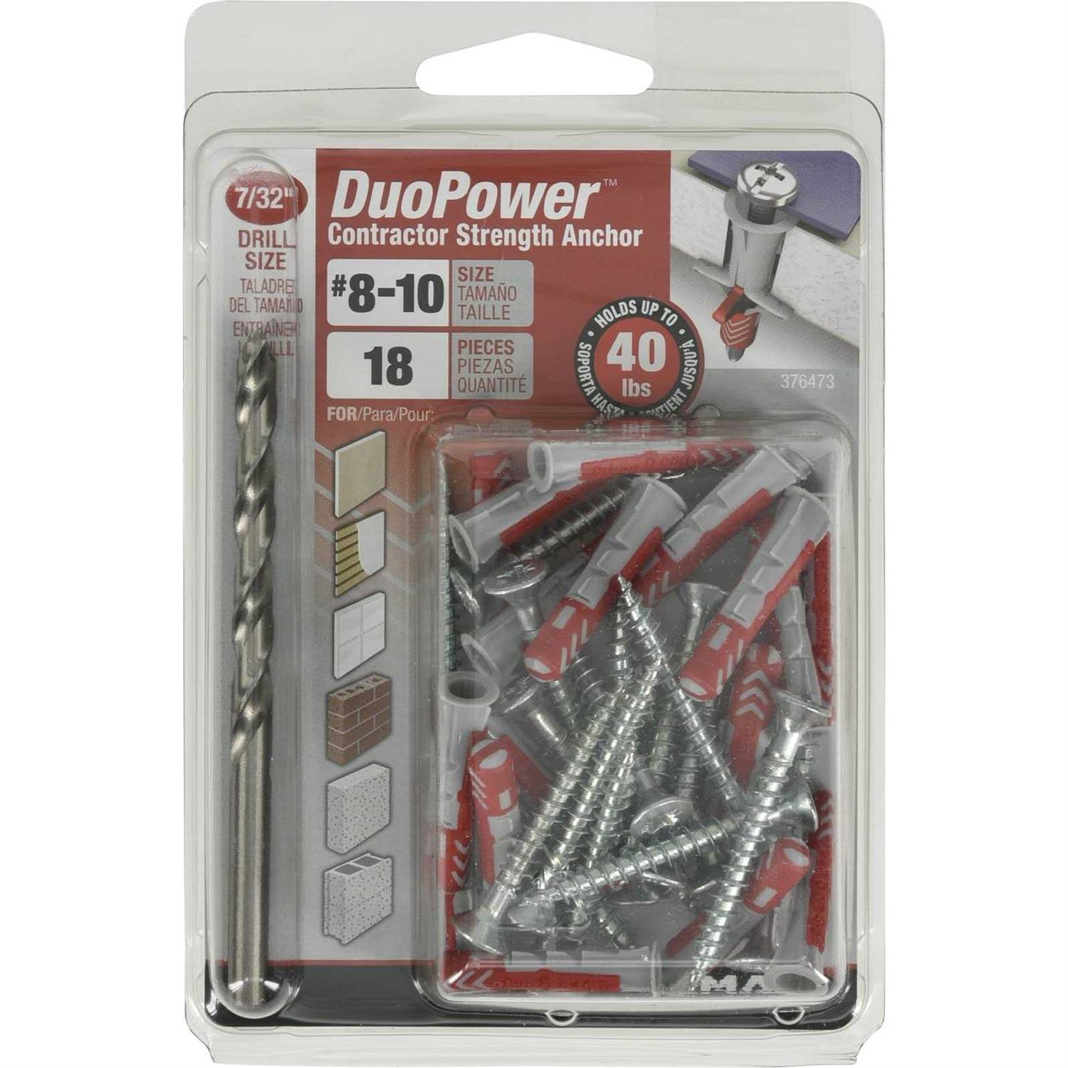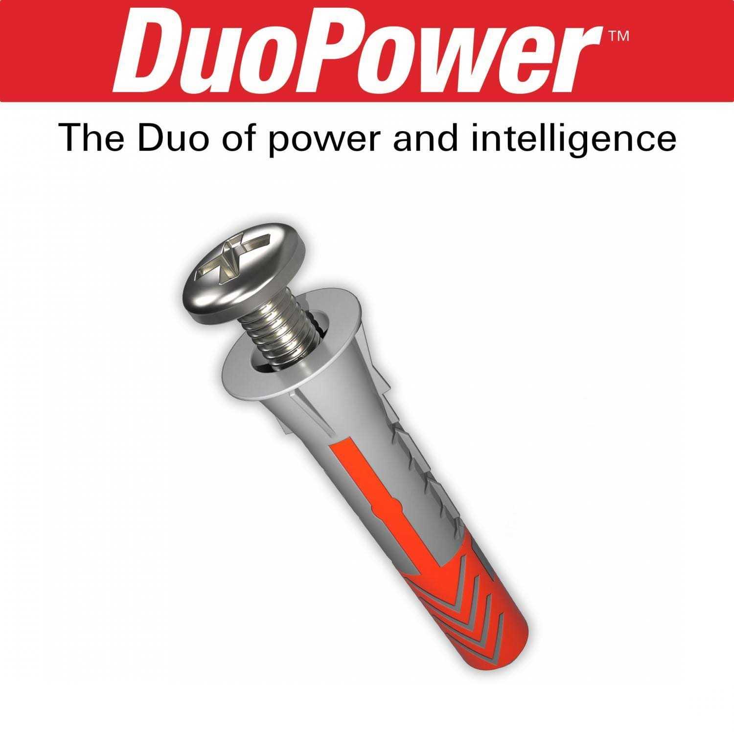 DuoPower is a one-product solution for quick and easy fastening in a variety of applications and base materials. The gray nylon components automatically activate the optimum product function (expansion, folding, knotting) for the best hold. The red expansion wings support secure expansion and offer additional security to the gray component. Ideal for hanging electrical fixtures, drapery supports, kitchen and bathroom accessories, pictures, mirrors and more. Anchors with a drill size of 3/16 in. accept #4-6 screw sizes. Anchors with a drill size of 1/4 in. accept #6-10 screw sizes. Anchors with a drill size of 5/16 in. accept #8-12 screw sizes.