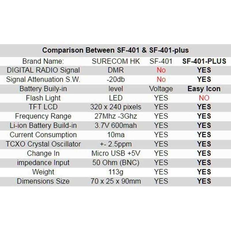 Powerful signal strength indicator to measure walkie talkies continuous carrier signal frequency for wireless enthusiasts Features: * CTCSS/DCS Decoder * LCD Dim level setting * Frequency digital 0.000 or 0.0000 * Work by TCXO(Temperature Compensate Xtal (crystal) Oscillator) 2? 2.5ppm * Color Display 240×320 * Build-in Li-ion battery * Only four-button control means easy to use * Small size allows hand holding. * Auto power off 1-9minutes * Charging battery LED indicator Package Contents: 1x SF401 PLUS Frequency Counter 1x UHF Antenna 1x English User Manual 1x USB charger cable 1x USB AC adapter 100-240V Note: Steps of If Frequency Counter Cannot Check VHF Frequency 1) Swtich the ATT button into left hand side. 2) Then change the antenna into VHF or Dual band, as customer are using UHF antenna, but checking VHF band.