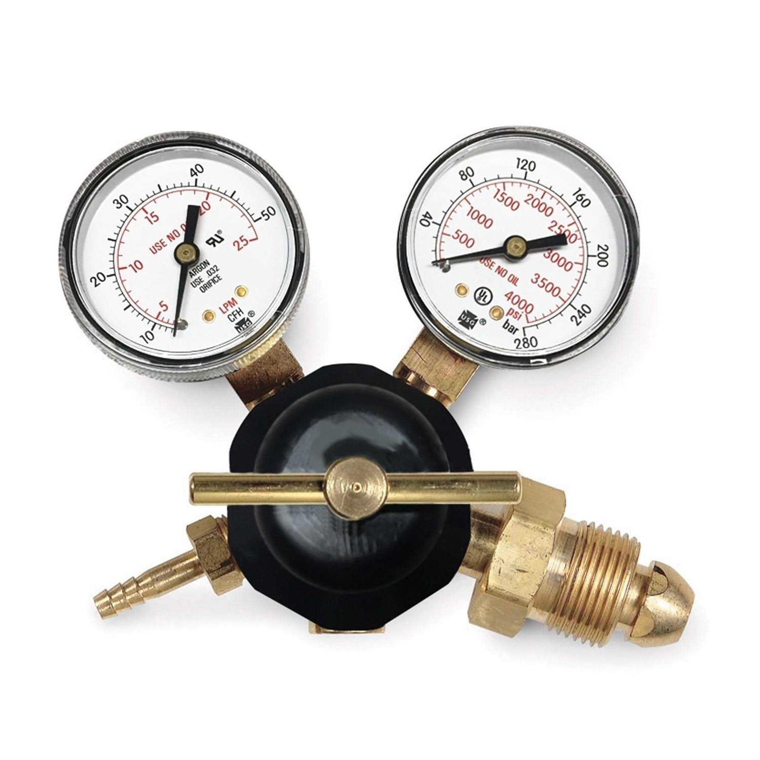 This Hobart Flow Gauge MIG Regulator with 5″ hose (770971) for your Hobart Handler or similar small MIG or TIG welder. Flow gauge regulator features dual two inch gauges with shatter-resistant polycarbonate lenses. Aluminum bonnet resists corrosion. Brass CGA-580 inlet fits all inert gas cylinders, including argon and argon mixes. Brass barb outlet accommodates included 5′ shielding gas hose. Gas flow rate is adjustable with brass “T” handle. Flow gauge features inlet filters and pressure relief device.