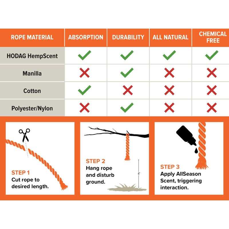 Why Our HempScent Rope? HODAG HempScent rope is specifically blended with natural, non-chemically treated hemp fibers. This allows for maximum absorbtion, durability, & effectiveness in the deer scent communication process. Other man-made ropes (such as Manilla, Cotton, Polyester, and Nylon) do not posess these qualities, are susceptable to breakdown in the elements, and are chemically treated. Hunters understand the value and power of scent when it comes to deer communication. Using the HODAG HempScent Rope System allows you to create an extremely effective deer communication hub exactly where you want it.Hang the HempScent Rope over a mock scrape, apply the AllSeason scent to create initial interaction, and jumpstart an extremely effective way to put deer in-front of your camera or stand. Bundle includes 6 ft of the highest quality 3/4 in diameter hemp rope available. Cut the rope to the desired length for your specific setup. Attatch a zip tie, piece of tape, or baylor twine 5 to 6 in up the rope, leaving a stretch to unravel and fray at the bottom. Apply AllSeason Scent liberally to stimulate physical interaction, which begins the scent marking process. Don’t be afraid to experiment, and get creative with your setups. There is no wrong way to do it, the deer will tell you what they prefer best.