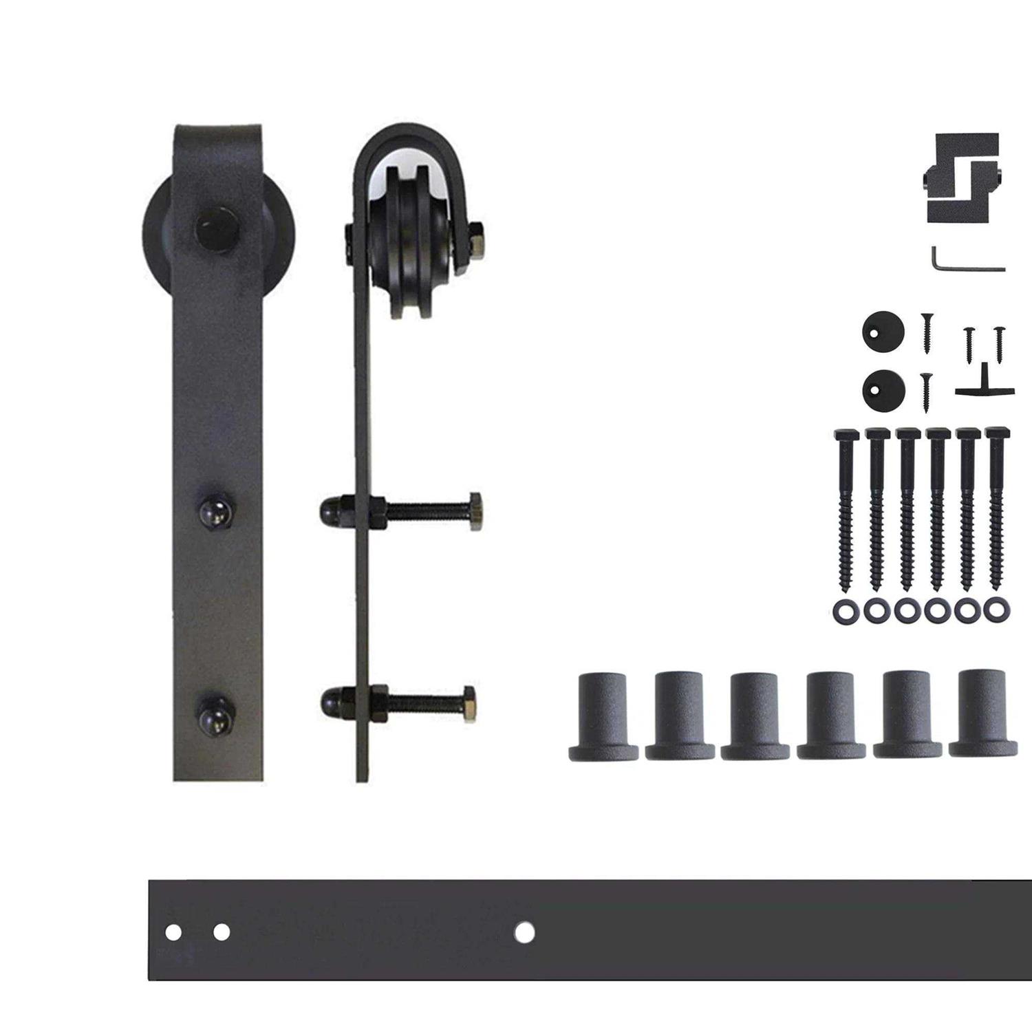 - 96-in Rustic Black Interior/Exterior J-strap Barn Door Kit