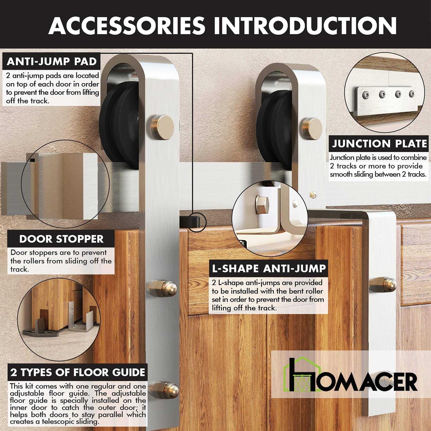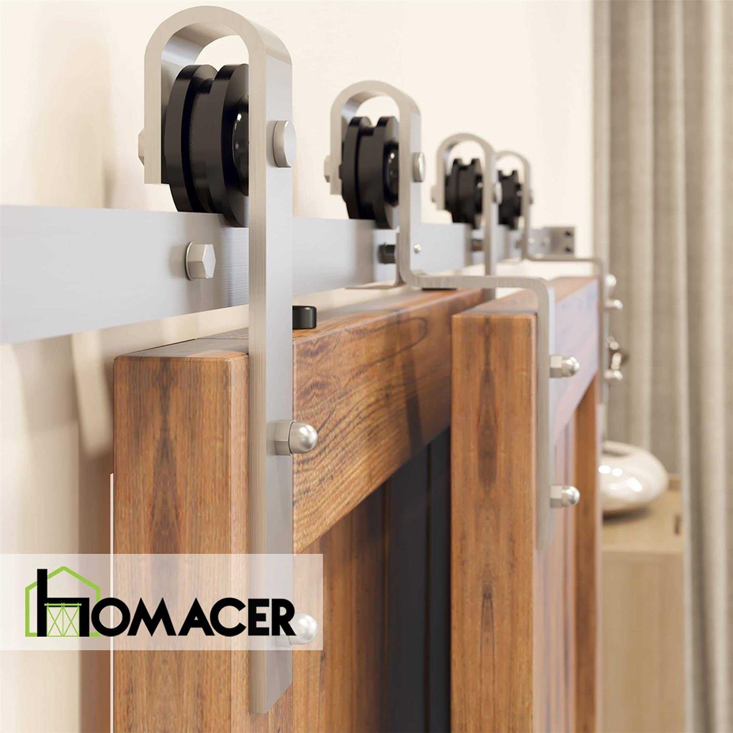 BYPASS OPTIONS MADE AVAILABLE ON ONE TRACK. It is never an easy job to install a double track bypass kit. Sometimes the clearance you have is not enough, sometimes the gap between the two doors is too large, and sometimes it is just frustrating to put all the pieces together. Now, with our single track bypass option, installing a bypass kit has never been easier. You can just follow the steps for a standard double door kit and replace the regular hangers with the bending ones. NOT ENOUGH SPACE? NOT A PROBLEM! Ever frustrated that the ordinary bypass hardware taking too much space with its bulky appearance? It only requires 6 inches clearance and if you are short in the room between the top of the door to the ceiling, the single track bypass will be a perfect choice. QUALITY IS 100% UNDER CONTROL. The nickel powdered coating makes the paint stays forever and will not be scratched off. The wheels of the roller are made of high-quality nylon which ensures minimal noise when it glides on the track. Each hardware kit can hold a total door(s) weight up to 220 lbs. BARN DOOR HARDWARE INSTALLATION MADE EASY. I understand it is stressful and time consuming to mount the double track bypass because you have to level the two flat tracks correctly and complex installation for the bypass doors. So do I! Homacer single track bypass allows your beautiful barn doors to slide bypass with each other on JUST ONE TRACK.You will also receive the step by step instructions with fractional measurements and concise word instructions with pictures. MONEY AND TIME SAVER FOR YOUR PROJECT. Tired of spending hell lot of money and time when searching for the proper size and type of hardware at the big box store? Not the case here! No more hassle to go back and forth for the missing or replacement parts. br HOMACER aims to provide the best value products and services to save your time and money when you think of installing a sliding door at your home! br br Pre-install Notice: /b br br 1. The hardware package only has lag bolts for wooden wall or drywall. br br 3. Our sliding barn door hardware kit is compatible with door thickness from 1 3/8 inches to 1 3/4 inches. The spacer extension will extend the track further from the wall to fit the thicker door. br br 4. If you have a door trim, you’d better put a header board that is as thick as the trim and then attach the hardware to the header board. br br 5. From the top of the door to the ceiling, you need to have at least 6 Inches clearance for the single track bypass hardware kit. br br 6. All tracks that are 7.5FT and under come in one piece. All tracks that are 8FT and above are connected by two tracks using a junction plate. Thus, the spacing between the middle two holes may not be 16 inches. The 18FT track is connected by three 6FT tracks and the 20FT track is connected by three 6.6FT track.