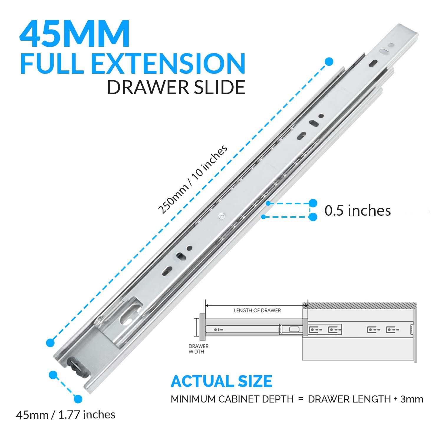 Premium & Low Maintenance: Our dresser drawer slides are manufactured using high-grade cold-rolled steel with zinc plating to prevent rust and corrosion, ensuring durability. Auto locking feature keeps your drawer from falling off the track Heavy Duty, Full Extension Design: Our drawer slide is 10 inch long, 1/2 inch thick with holding capacity of 100 lbs without getting bent, having an extension limit of 250mm to allow easy access to the entire drawer Noiseless Gliding: Homands steel ball bearing drawer slides ensures smooth and noise free gliding of the drawers without getting stuck or applying any excessive force while opening and closing Versatile Usage: These 10 inch drawer slides are compatible with any type of cabinetry and general storage drawers. Perfect for newly constructed, remodelling and replacement projects Quick Installation: Comes with 12 mounting screws and are easy to install with the help of a driller. Our drawer sliders are built to withstand rigors of daily use. Whether you need to replace damaged or missing drawer glides and slides or installing new for the first time, HOMANDS drawer track most bottom/side-mounted drawer system, and are proposed to use with face frame or frameless cabinets. br With a maximum load capacity of 100 lbs, the shelf slide rails set is sturdy and can be used for years. It features a positive stop in the closed position and a double stop in the extended position that locks your full extension ball bearing side mount drawer slides open, so it cannot be pulled too far out and fall off the tracks. Installation is quick and easy, and the draw slides kit contains all necessary fasteners. br Solid steel, no noise during opening and closing br Internal rail separation is simple and easy to install br Use on bedroom furniture, sliding cabinet doors, office cabinets, and bathroom cabinets. Installation: There is a plastic buckle on the back of the inner rail and the drawer can be easily taken out by pressing it. Here are some tips for installation Size selection: Slide length less than or equal to drawer depth minus 4 mm. br Mark the placement of the slides br Position the slides br Install the slides br Mark the drwaer sides br Position the slide Extension br Attach the slides to the drawer br Insert the drawer br Position the drawer face br Attach the drawer face br