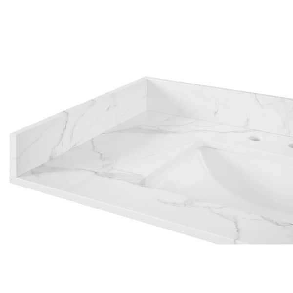 High-end Calacatta white Engineered Marble side splash protects your walls and cabinets from water damage. Universal left or right fit. Complements 22 in. deep Engineered Marble vanity tops. Color: White/Polish.