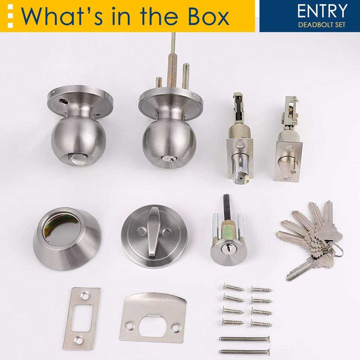 PRODUCT INTRODUCTION: Keyed Entry Door Knob:Keyed entry door knobs are keyed on the exterior and turn button on the inside that can quickly and easily lock or unlock the latch mechanism. Single Cylinder Deadbolt:Single cylinder deadbolt set is locked/unlocked with a key from the exterior and locked/unlocked from the inside of the home with a thumb turn. Single cylinder lever set is by far the most popular function of handle set. DoubleCylinderDeadbolt:Double cylinder deadbolt sets have a keyed lock on both sides of the lever set. This means that to exit or enter the door you must have a key to unlock the door. Some people use double cylinder lever sets on glass doors where they are concerned that someone may be able to break the glass and unlock the door from the inside. PRODUCT FEATURES: –Type: Key Entry Door Knob and Single Cylinder Deadbolt Set –Material: Stainless Steel –Hardware Finish: Satin Nickel –Handing: Left, Right, Universal –Backset