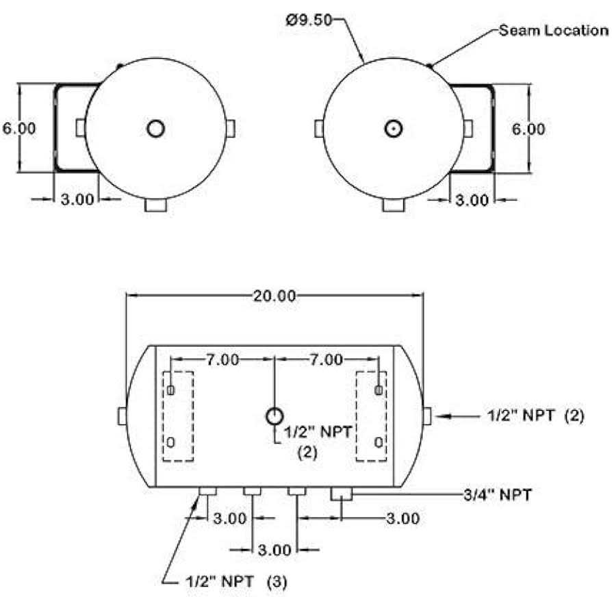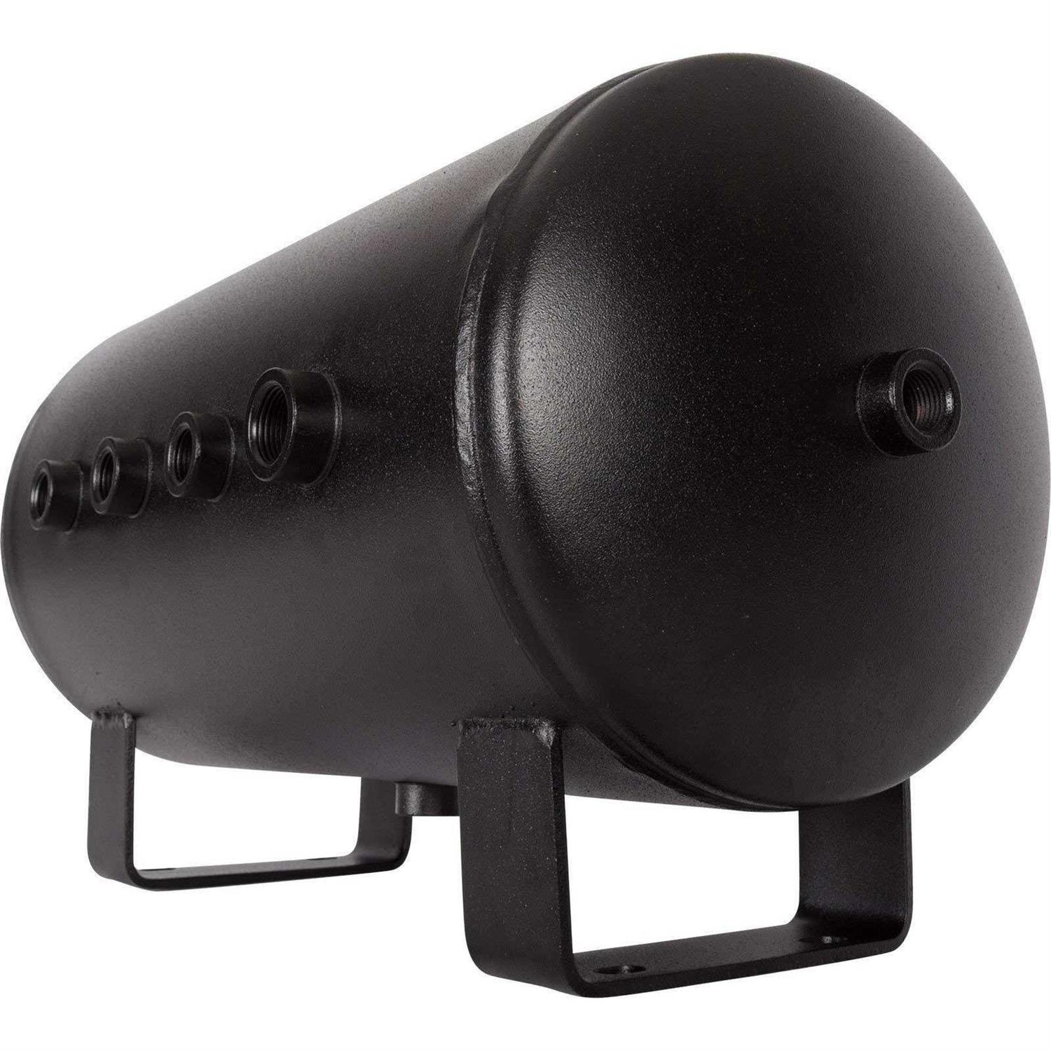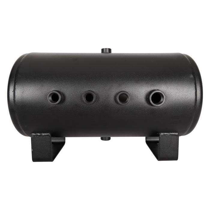 Need more air? This 5 gallon air tank is perfect to use with train horns, air tools, kite-surfing, tire-inflating, or just about any onboard air application. The tank is rated to twice its stated working pressure and is capable of holding 300 PSI without problems. Better yet it meets all DOT specifications and is burst rated to 800 PSI. This strong steel 5 gallon air tank has sevent 12 ports and one 34 port. 12 ports are perfect for high-flow applications like train horns (the real ones like AirChimes or Leslies). The large diameter of the ports prevents bottle necking that you might find with smaller air tanks. There are 4 ports on the side, 1 on each end, 1 on top, and 1 on the bottom respectively. This makes it very convenient to install a drain cock and safety blow-off valve even if you mount the tank upside down.