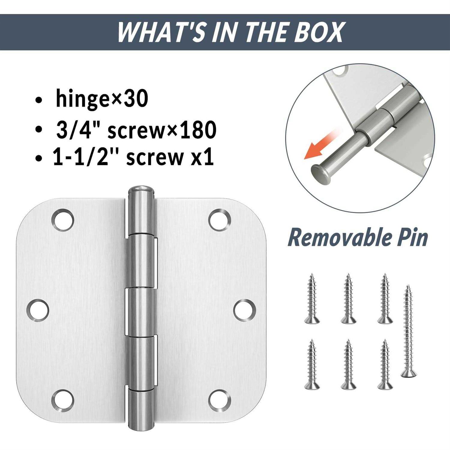 Made of high-quality steel with a brushed nickel finished coating for rust and corrosion resistance. Removable pins allow for easy installation or scrapping of doors within minutes. Includes necessary mounting screws, no need for extra purchasing. Suitable for bedroom, storage room, basement entrance, garage, bathroom, and other indoor doors.